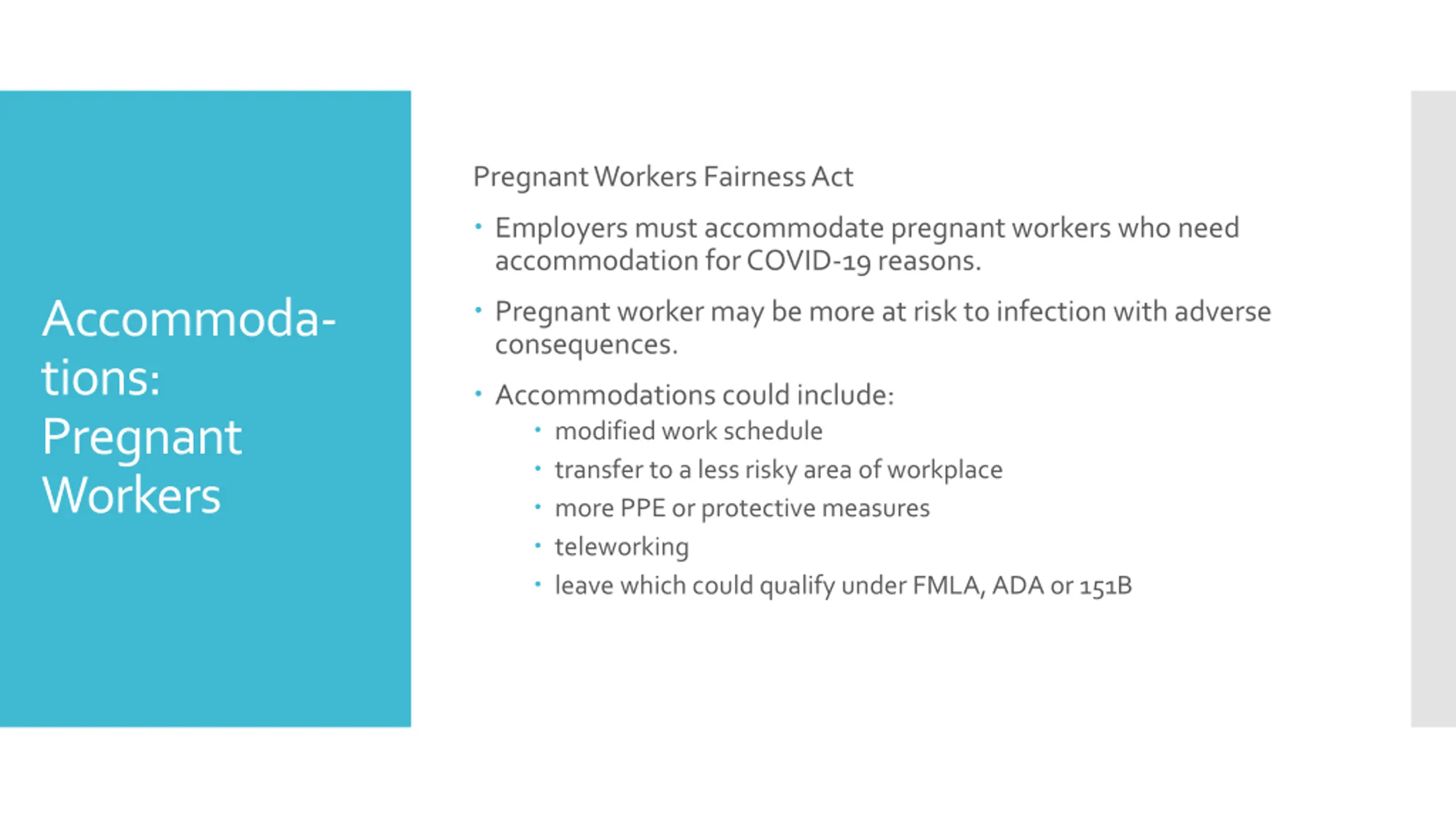 Pregnant Workers Fairness Act Employers must accommodate pregnant workers who need accommodation for COVID-19 reasons. Accommoda- tions: Pregnant Workers Pregnant worker may be more at risk to infection with adverse consequences. Accommodations could include: modified work schedule transfer to a less risky area of workplace more PPE or protective measures teleworking leave which could qualify under FMLA, ADA or 151B