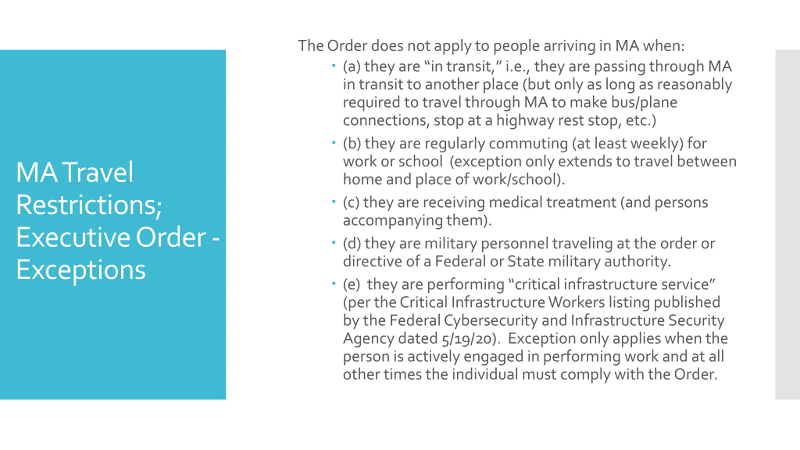 The Order does not apply to people arriving in MA when: (a) they are in transit, i.e., they are passing through MA in transit to another place (but only as long as reasonably required to travel through MA to make bus/plane connections, stop at a highway rest stop, etc.) (b) they are regularly commuting (at least weekly) for work or school (exception only extends to travel between home and place of work/school). (c) they are receiving medical treatment (and persons accompanying them). (d) they are military personnel traveling at the order or directive of a Federal or State military authority. (e) they are performing critical infrastructure service (per the Critical Infrastructure Workers listing published by the Federal Cybersecurity and Infrastructure Security Agency dated 5/19/20). Exception only applies when the person is actively engaged in performing work and at all other times the individual must comply with the Order. MA Travel Restrictions; Executive Order - Exceptions