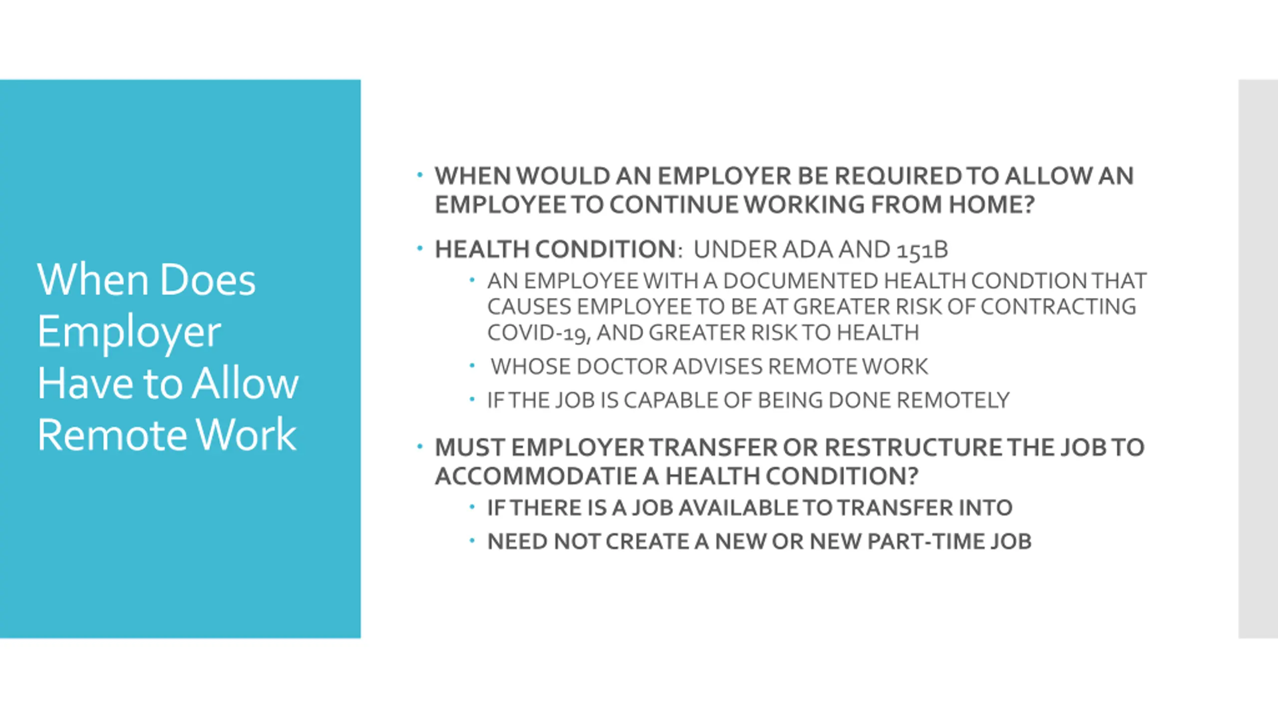 WHEN WOULD AN EMPLOYER BE REQUIRED TO ALLOW AN EMPLOYEE TO CONTINUE WORKING FROM HOME? HEALTH CONDITION: UNDER ADA AND 151B AN EMPLOYEE WITH A DOCUMENTED HEALTH CONDTION THAT CAUSES EMPLOYEE TO BE AT GREATER RISK OF CONTRACTING COVID-19, AND GREATER RISK TO HEALTH WHOSE DOCTOR ADVISES REMOTE WORK IF THE JOB IS CAPABLE OF BEING DONE REMOTELY When Does Employer Have to Allow Remote Work MUST EMPLOYER TRANSFER OR RESTRUCTURE THE JOB TO ACCOMMODATIE A HEALTH CONDITION? IF THERE IS A JOB AVAILABLE TO TRANSFER INTO NEED NOT CREATE A NEW OR NEW PART-TIME JOB