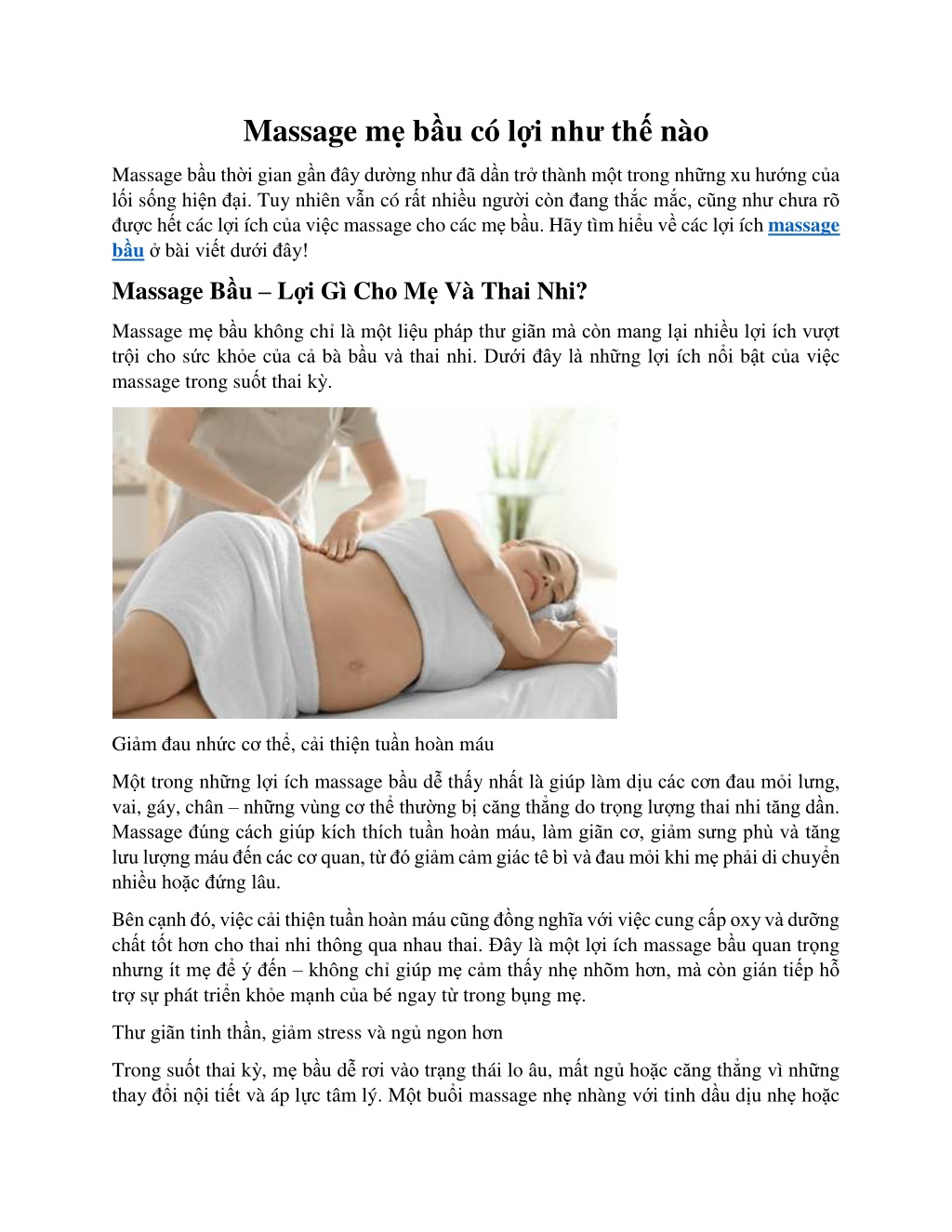 Massage m bu c li nh th no Massage b u th i gian g n y d ng nh d n tr th nh m t trong nh ng xu h ng c a l i s ng hi n i. Tuy nhi n v n c r t nhi u ng i c n ang th c m c, c ng nh ch a r c h t c c l i ch c a vi c massage cho c c m b u. H y t m hi u v c c l i ch massage b u b i vi t d i y! Massage B u L i G Cho M V Thai Nhi? Massage m b u kh ng ch l m t li u ph p th gi n m c n mang l i nhi u l i ch v t tr i cho s c kh e c a c b b u v thai nhi. D i y l nh ng l i ch n i b t c a vi c massage trong su t thai k . Gi m au nh c c th , c i thi n tu n ho n m u M t trong nh ng l i ch massage b u d th y nh t l gi p l m d u c c c n au m i l ng, vai, g y, ch n nh ng v ng c th th ng b c ng th ng do tr ng l ng thai nhi t ng d n. Massage ng c ch gi p k ch th ch tu n ho n m u, l m gi n c , gi m s ng ph v t ng l u l ng m u n c c c quan, t gi m c m gi c t b v au m i khi m ph i di chuy n nhi u ho c ng l u. B n c nh , vi c c i thi n tu n ho n m u c ng ng ngh a v i vi c cung c p oxy v d ng ch t t t h n cho thai nhi th ng qua nhau thai. y l m t l i ch massage b u quan tr ng nh ng t m n kh ng ch gi p m c m th y nh nh m h n, m c n gi n ti p h tr s ph t tri n kh e m nh c a b ngay t trong b ng m . Th gi n tinh th n, gi m stress v ng ngon h n Trong su t thai k , m b u d r i v o tr ng th i lo u, m t ng ho c c ng th ng v nh ng thay i n i ti t v p l c t m l . M t bu i massage nh nh ng v i tinh d u d u nh ho c