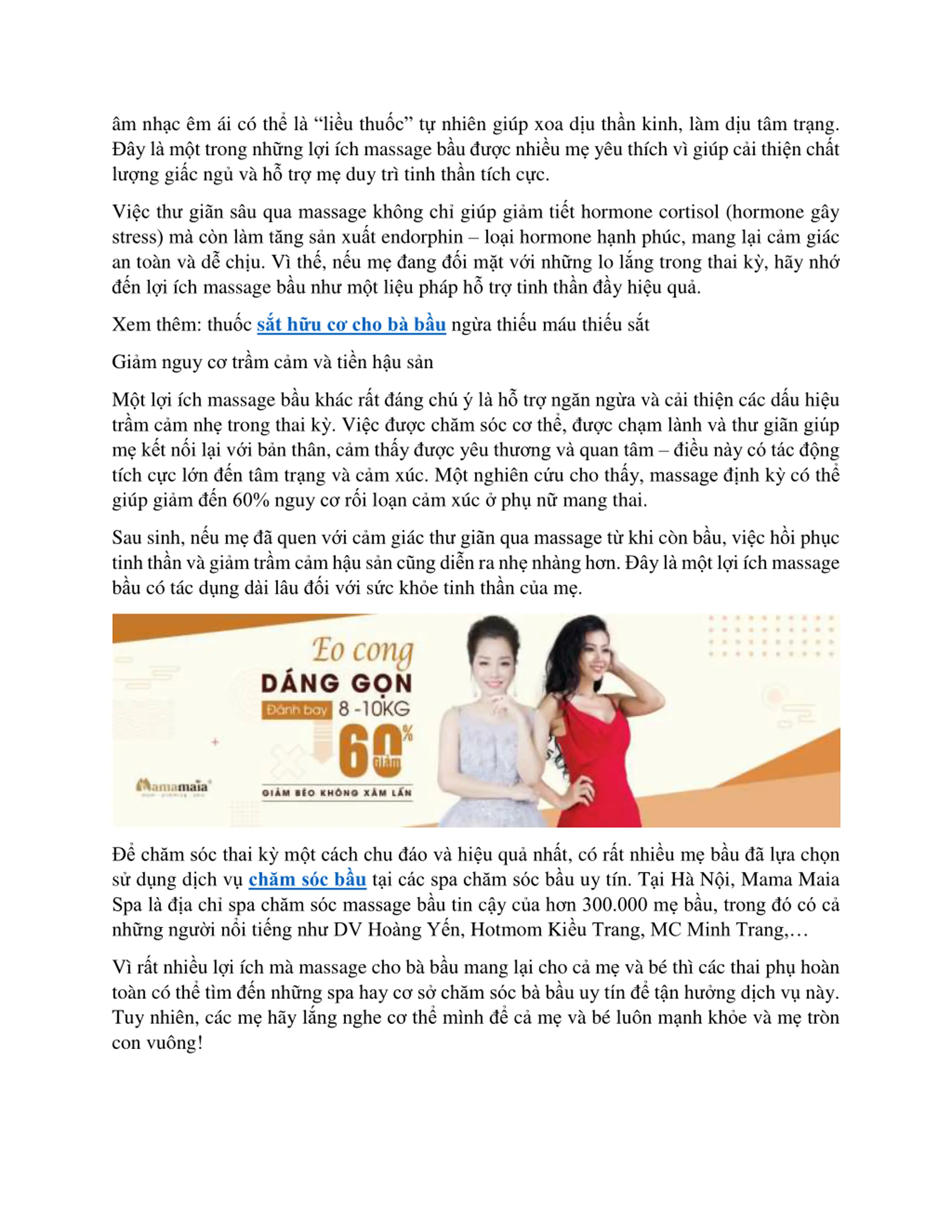 m nhc m i c thl liu thuc t nhin gip xoa du thn kinh, lm du tm trng. y l m t trong nh ng l i ch massage b u c nhi u m y u th ch v gi p c i thi n ch t l ng gi c ng v h tr m duy tr tinh th n t ch c c. Vi c th gi n s u qua massage kh ng ch gi p gi m ti t hormone cortisol (hormone g y stress) m c n l m t ng s n xu t endorphin lo i hormone h nh ph c, mang l i c m gi c an to n v d ch u. V th , n u m ang i m t v i nh ng lo l ng trong thai k , h y nh n l i ch massage b u nh m t li u ph p h tr tinh th n y hi u qu . Xem th m: thu c s t h u c cho b b u ng a thi u m u thi u s t Gi m nguy c tr m c m v ti n h u s n M t l i ch massage b u kh c r t ng ch l h tr ng n ng a v c i thi n c c d u hi u tr m c m nh trong thai k . Vi c c ch m s c c th , c ch m l nh v th gi n gi p m k t n i l i v i b n th n, c m th y c y u th ng v quan t m i u n y c t c ng t ch c c l n n t m tr ng v c m x c. M t nghi n c u cho th y, massage nh k c th gi p gi m n 60% nguy c r i lo n c m x c ph n mang thai. Sau sinh, n u m quen v i c m gi c th gi n qua massage t khi c n b u, vi c h i ph c tinh th n v gi m tr m c m h u s n c ng di n ra nh nh ng h n. y l m t l i ch massage b u c t c d ng d i l u i v i s c kh e tinh th n c a m . ch m s c thai k m t c ch chu o v hi u qu nh t, c r t nhi u m b u l a ch n s d ng d ch v ch m s c b u t i c c spa ch m s c b u uy t n. T i H N i, Mama Maia Spa l a ch spa ch m s c massage b u tin c y c a h n 300.000 m b u, trong c c nh ng ng i n i ti ng nh DV Ho ng Y n, Hotmom Ki u Trang, MC Minh Trang, V r t nhi u l i ch m massage cho b b u mang l i cho c m v b th c c thai ph ho n to n c th t m n nh ng spa hay c s ch m s c b b u uy t n t n h ng d ch v n y. Tuy nhi n, c c m h y l ng nghe c th m nh c m v b lu n m nh kh e v m tr n con vu ng!
