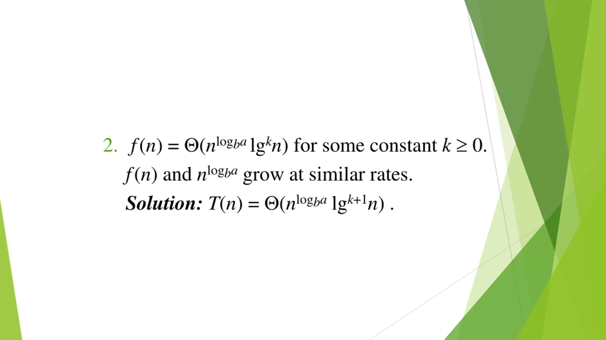 Three Common Cases 1. f(n) = O(nlogba ) for some constant > 0. f(n) grows polynomially slower than nlogba (by an n factor). Solution: T(n) = (nlogba) .