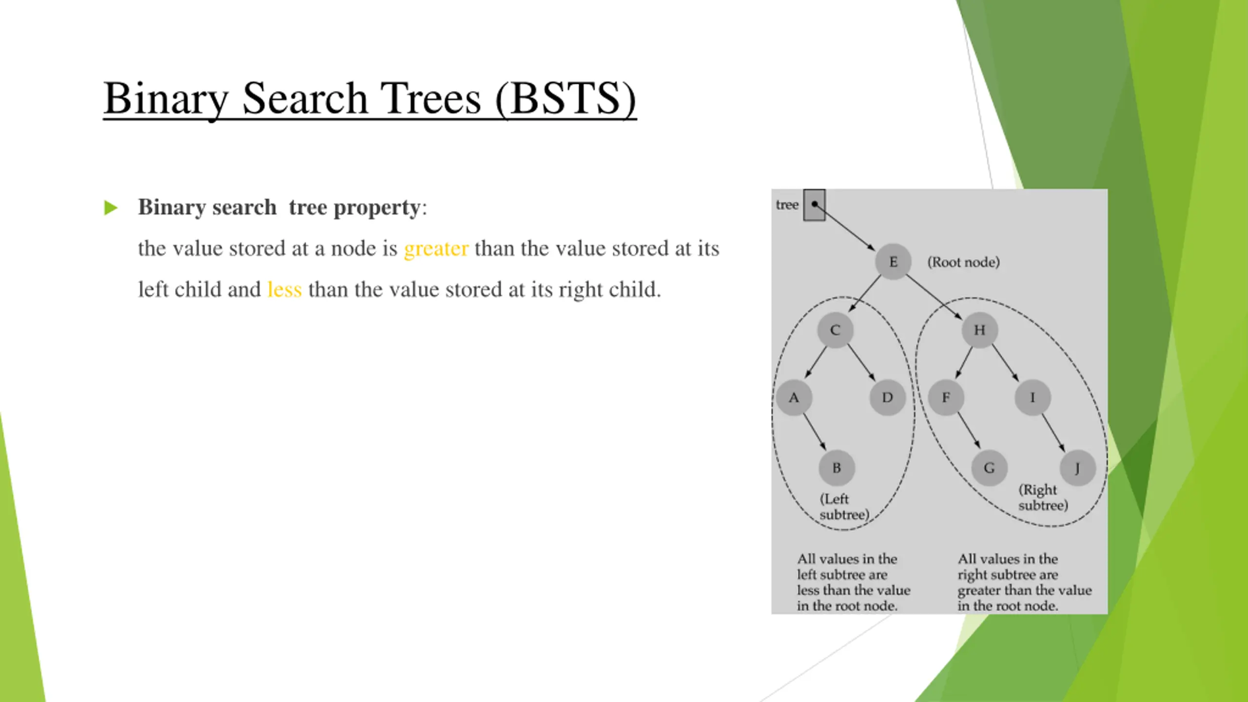 Binary Search Trees (BSTS) Binary search tree property: the value stored at a node is greater than the value stored at its left child and less than the value stored at its right child.