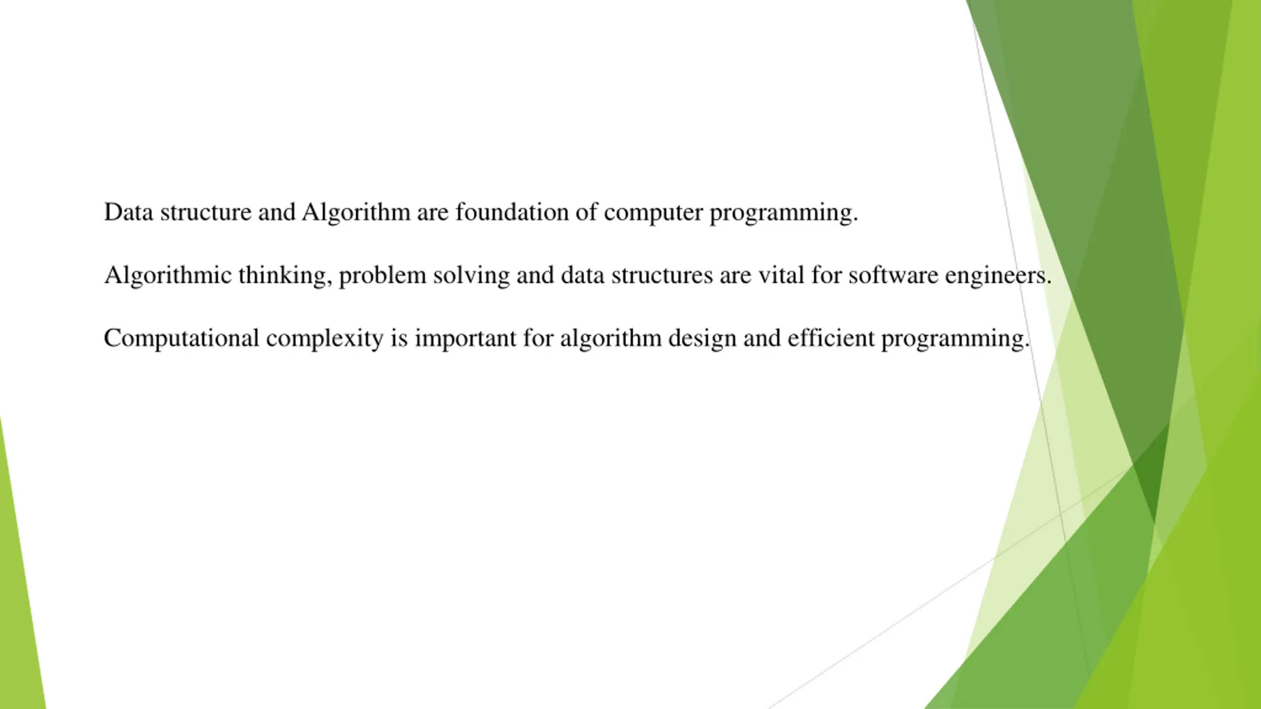 Data structure and Algorithm are foundation of computer programming. Algorithmic thinking, problem solving and data structures are vital for software engineers. Computational complexity is important for algorithm design and efficient programming.