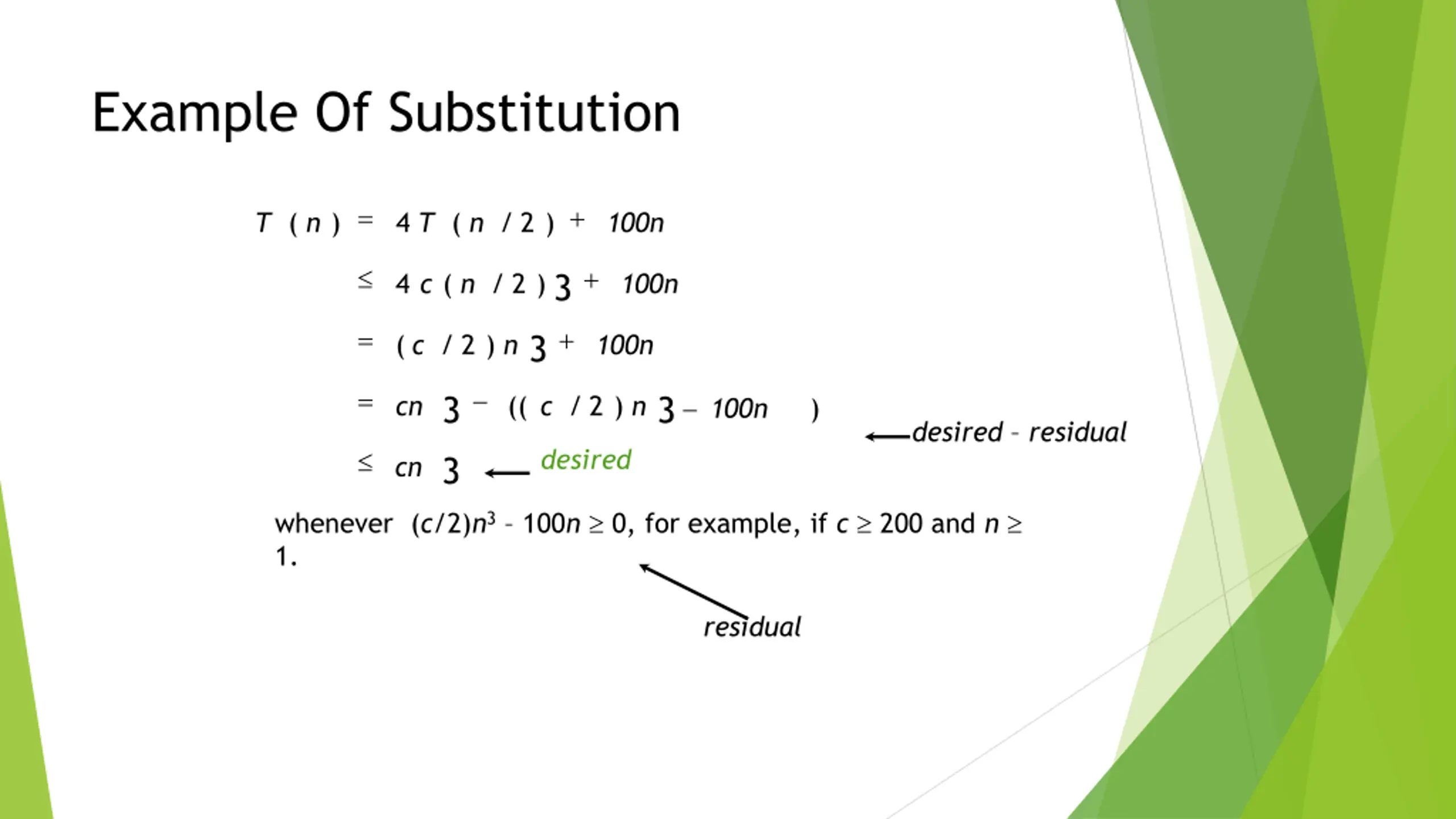 Example Of Substitution = + T ( n ) 4 T ( n / 2 ) 100n + 3 + 4 c ( n / 2 ) 100n = 3 ( c / 2 ) n 100n = 3 3 cn (( c / 2 ) n 100n ) desired residual desired 3 cn whenever (c/2)n3 100n 0, for example, if c 200 and n 1. residual