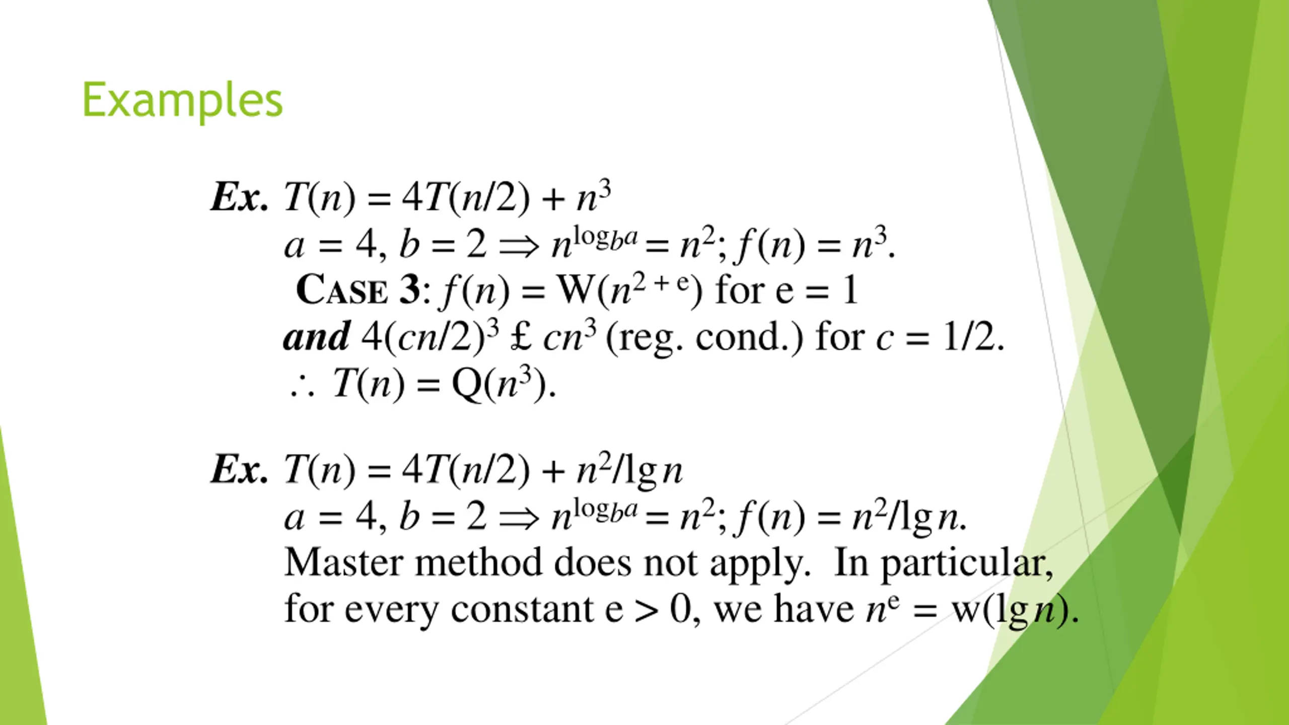Examples Ex. T(n) = 4T(n/2) + n3 a = 4, b = 2 nlogba = n2; f(n) = n3. CASE 3: f(n) = W(n2+ e) for e = 1 and 4(cn/2)3 cn3 (reg. cond.) for c = 1/2. T(n) = Q(n3). Ex. T(n) = 4T(n/2) + n2/lgn a = 4, b = 2 nlogba = n2; f(n) = n2/lgn. Master method does not apply. In particular, for every constant e > 0, we have ne= w(lgn).