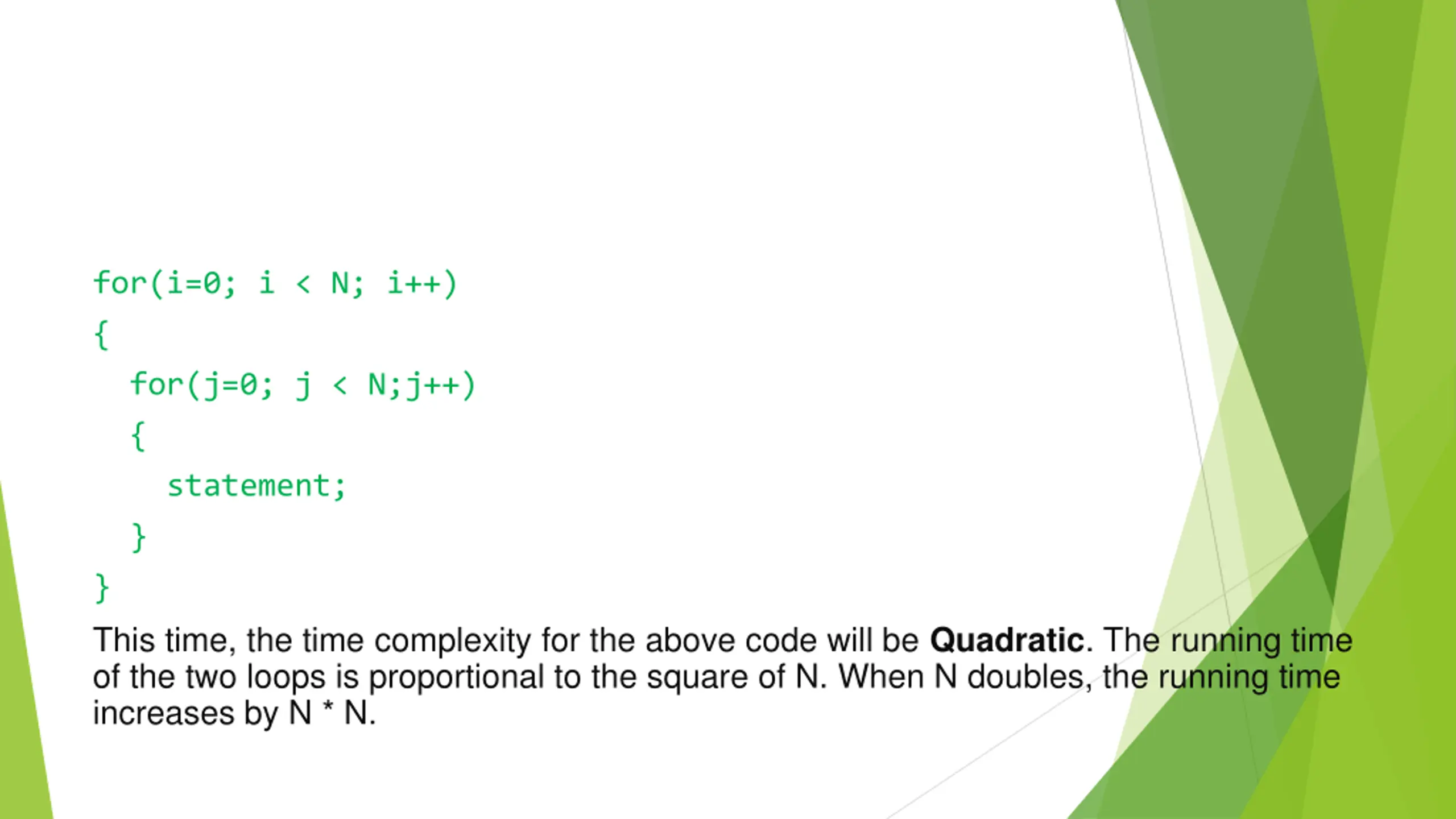 for(i=0; i < N; i++) { for(j=0; j < N;j++) { statement; } } This time, the time complexity for the above code will be Quadratic. The running time of the two loops is proportional to the square of N. When N doubles, the running time increases by N * N.