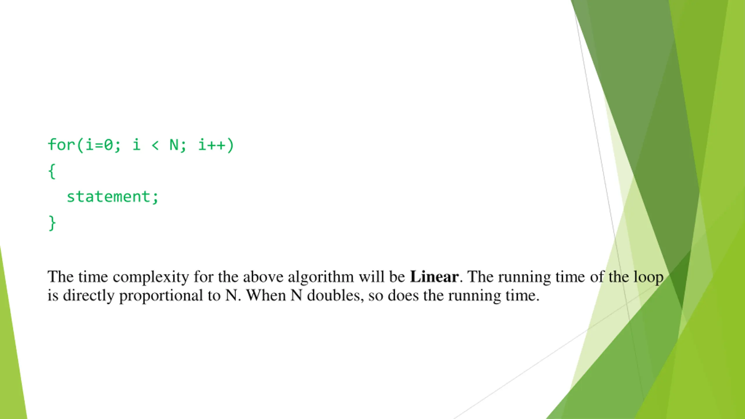 for(i=0; i < N; i++) { statement; } The time complexity for the above algorithm will be Linear. The running time of the loop is directly proportional to N. When N doubles, so does the running time.