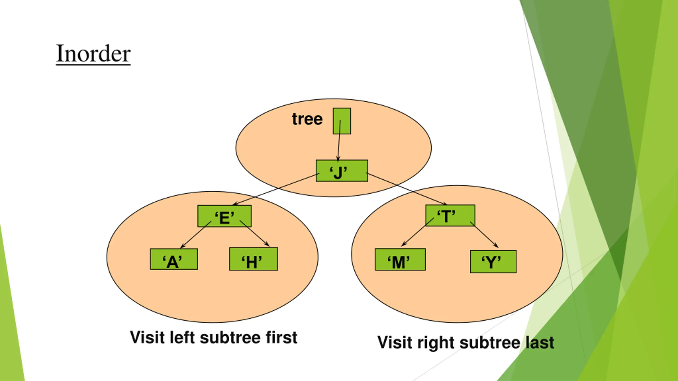 Inorder Visit second tree J T E A H M Y Visit left subtree first Visit right subtree last