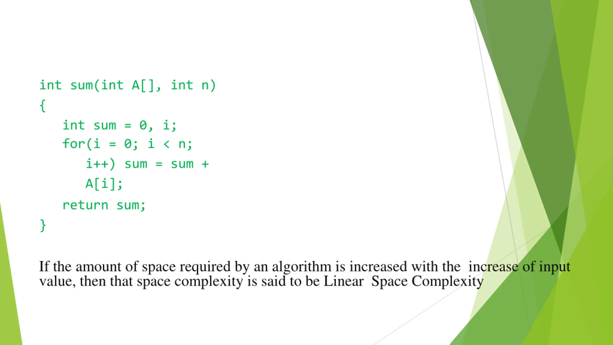 Linear Space Complexity int sum(int A[], int n) { int sum = 0, i; for(i = 0; i < n; i++) sum = sum + A[i]; return sum; } If the amount of space required by an algorithm is increased with the increase of input value, then that space complexity is said to be Linear Space Complexity