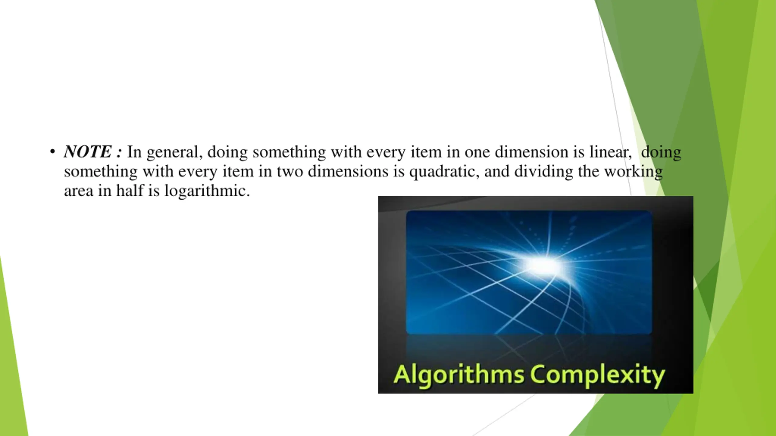 NOTE : In general, doing something with every item in one dimension is linear, doing something with every item in two dimensions is quadratic, and dividing the working area in half is logarithmic.