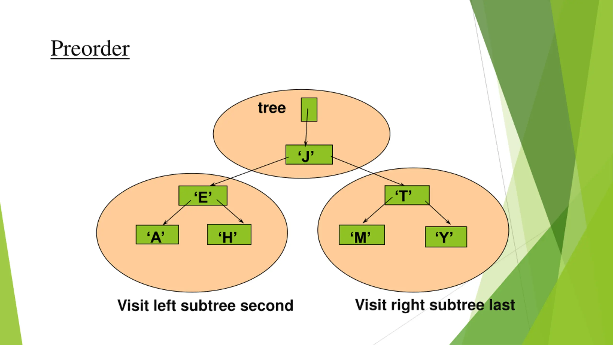 Preorder Visit first tree J T E A H M Y Visit right subtree last Visit left subtree second