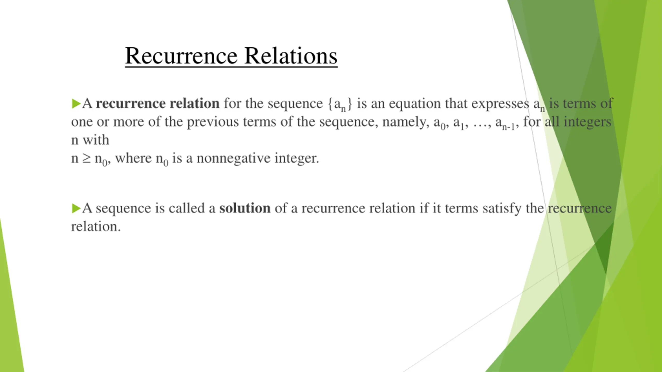 Recurrence Relations A recurrence relation for the sequence {an} is an equation that expresses an is terms of one or more of the previous terms of the sequence, namely, a0, a1, , an-1, for all integers n with n n0, where n0 is a nonnegative integer. A sequence is called a solution of a recurrence relation if it terms satisfy the recurrence relation.