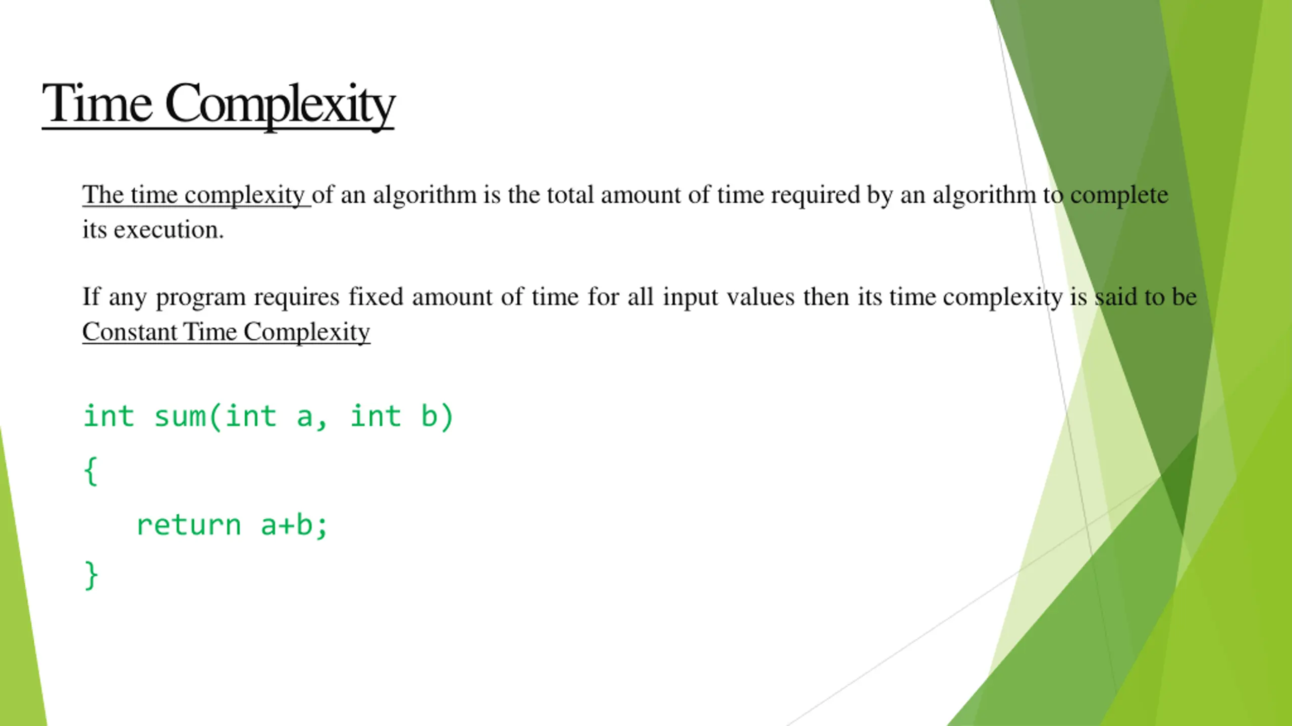 Time Complexity The time complexity of an algorithm is the total amount of time required by an algorithm to complete its execution. If any program requires fixed amount of time for all input values then its time complexity is said to be ConstantTime Complexity int sum(int a, int b) { return a+b; }