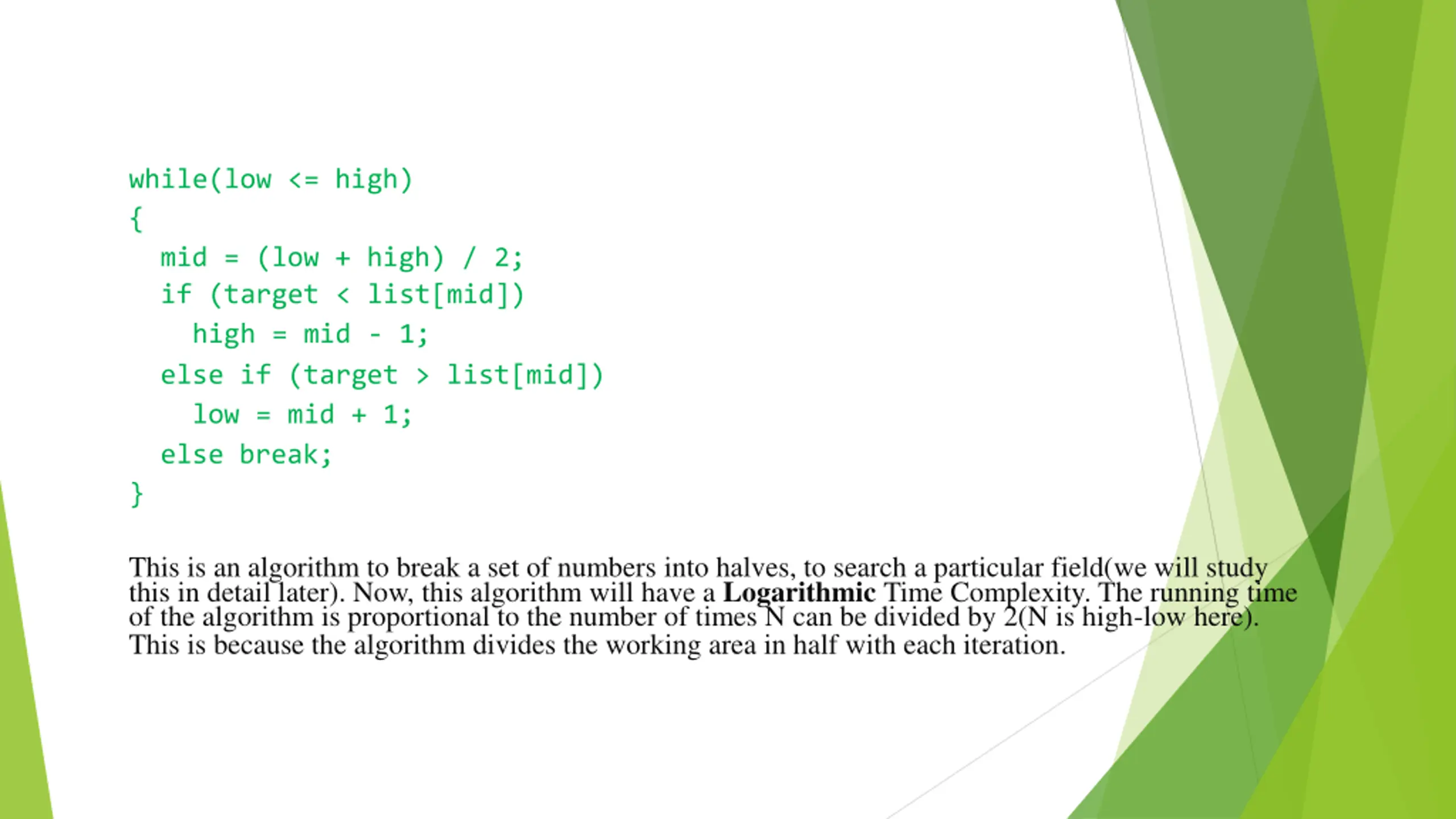 while(low <= high) { mid = (low + high) / 2; if (target < list[mid]) high = mid - 1; else if (target > list[mid]) low = mid + 1; else break; } This is an algorithm to break a set of numbers into halves, to search a particular field(we will study this in detail later). Now, this algorithm will have a Logarithmic Time Complexity. The running time of the algorithm is proportional to the number of times N can be divided by 2(N is high-low here). This is because the algorithm divides the working area in half with each iteration.