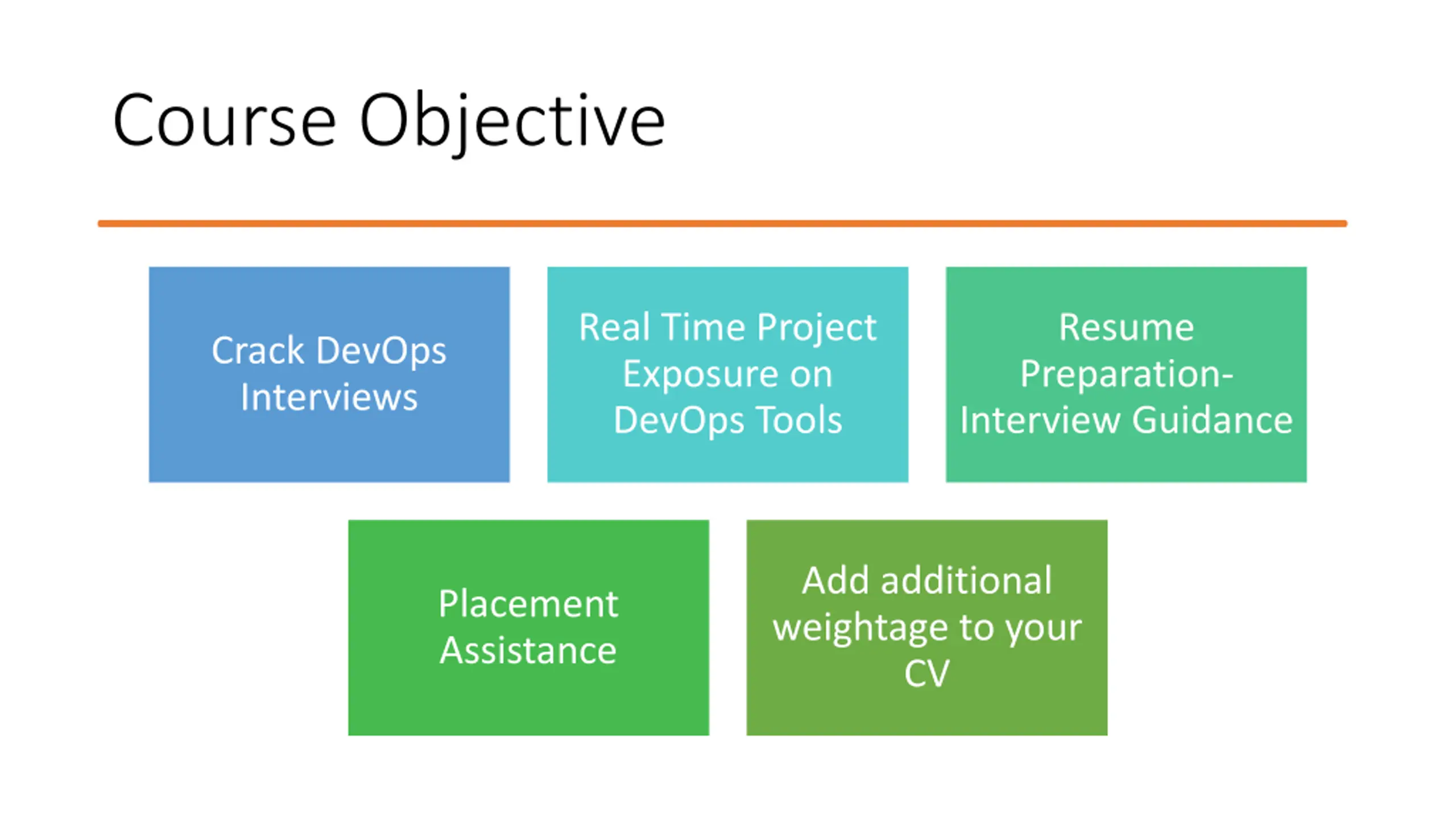Course Objective Real Time Project Exposure on DevOps Tools Resume Preparation- Interview Guidance Crack DevOps Interviews Add additional weightage to your CV Placement Assistance