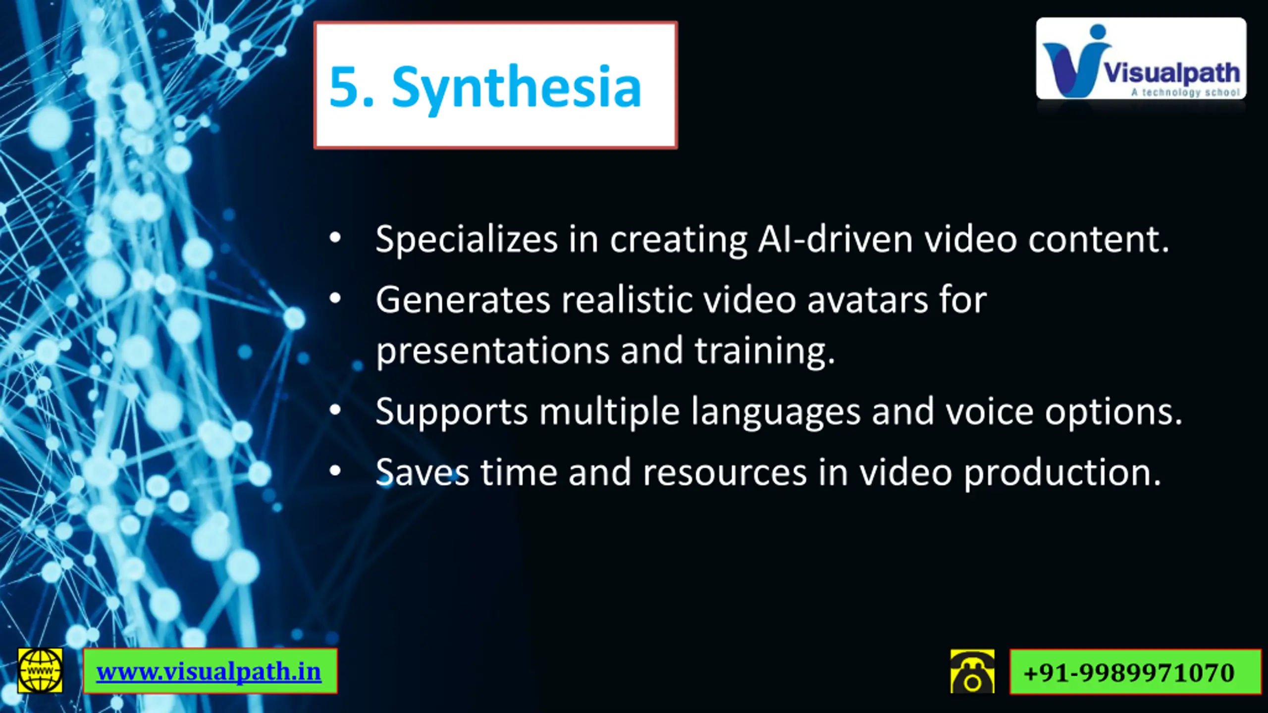 5. Synthesia Specializes in creating AI-driven video content. Generates realistic video avatars for presentations and training. Supports multiple languages and voice options. Saves time and resources in video production. www.visualpath.in +91-9989971070