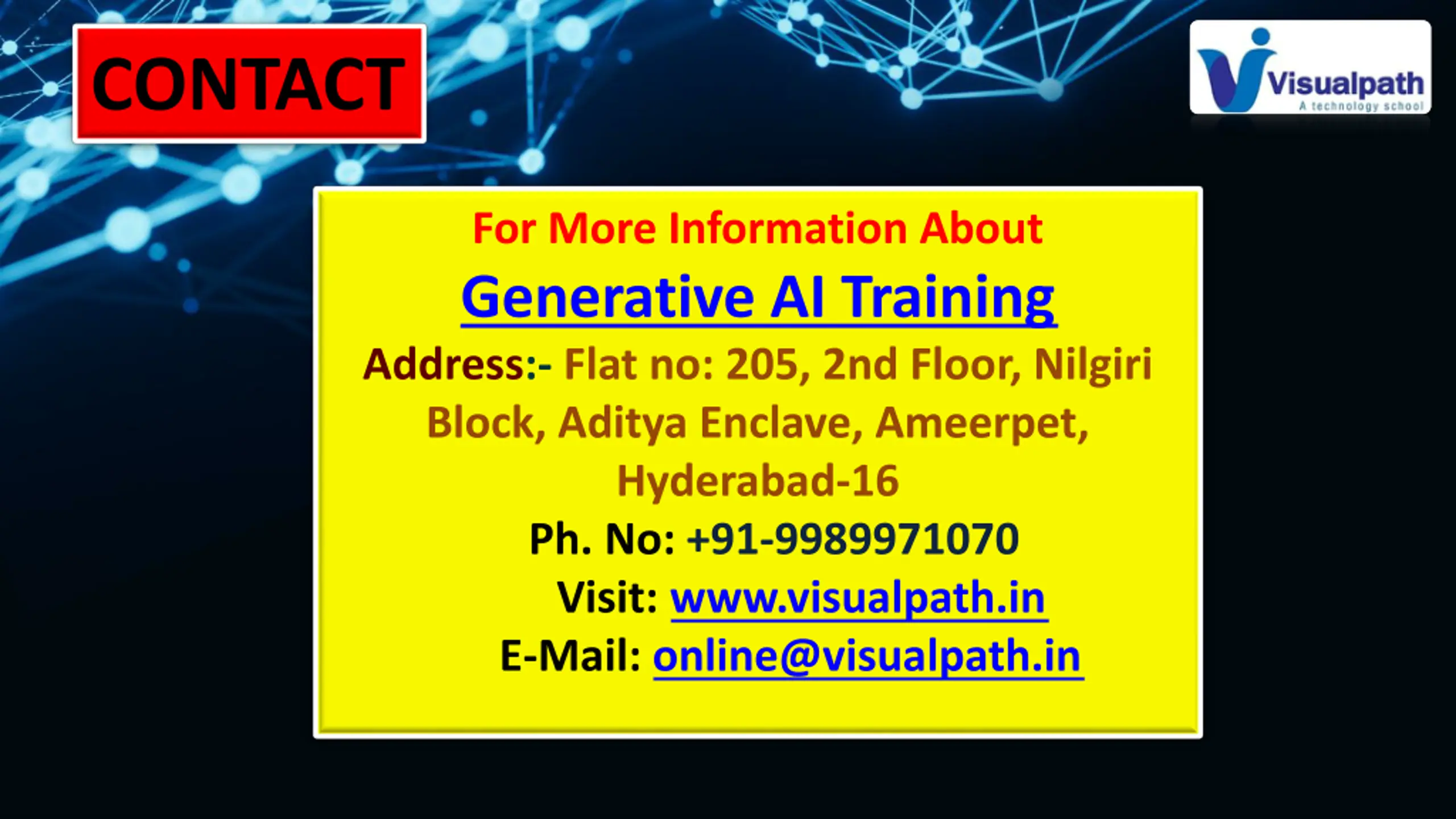 CONTACT For More Information About Generative AI Training Address:- Flat no: 205, 2nd Floor, Nilgiri Block, Aditya Enclave, Ameerpet, Hyderabad-16 Ph. No: +91-9989971070 Visit: www.visualpath.in E-Mail: online@visualpath.in