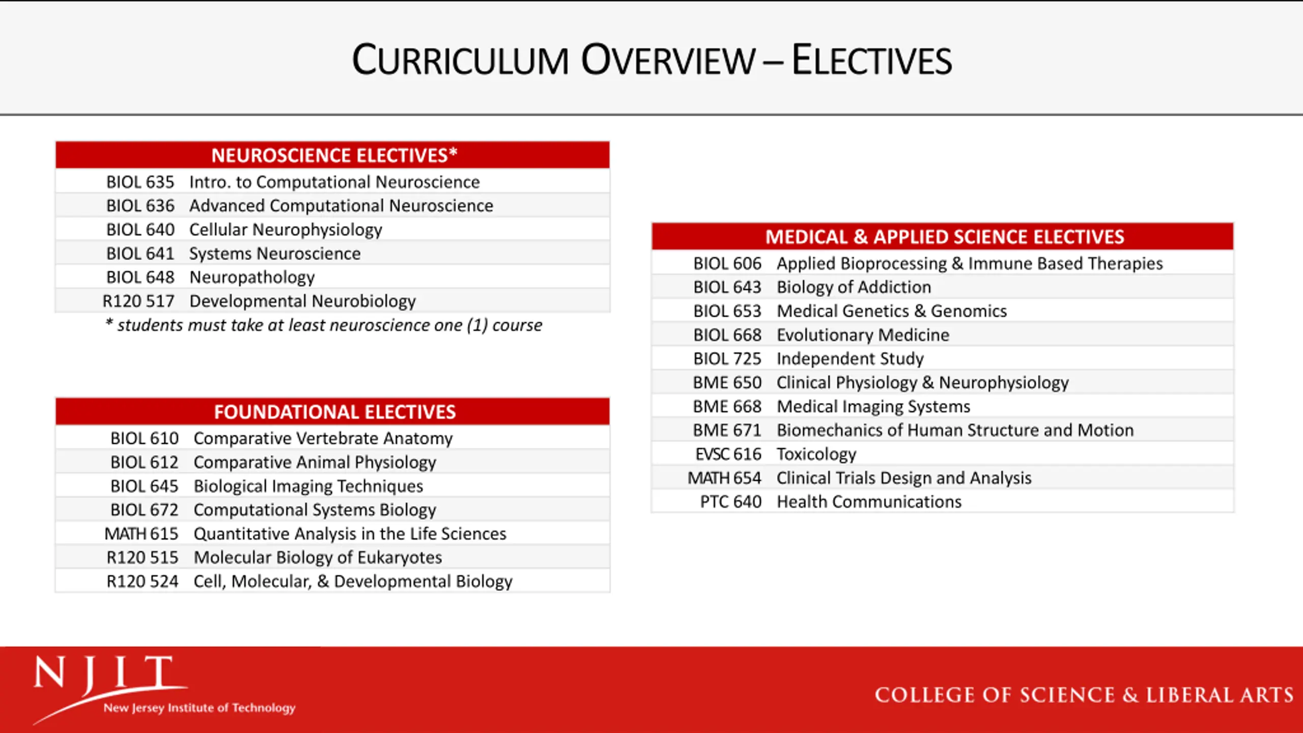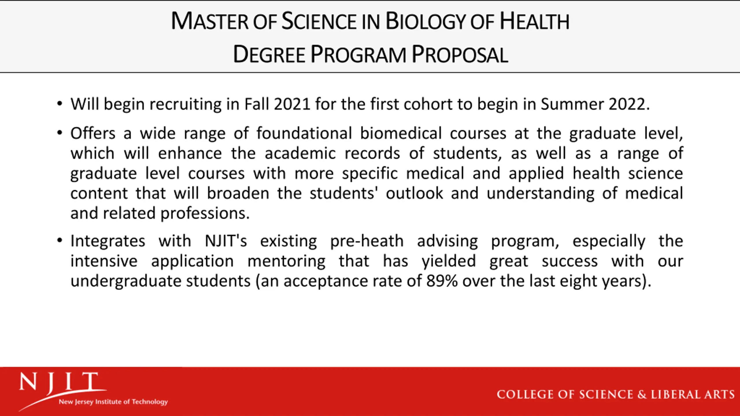 MASTER OF SCIENCE IN BIOLOGY OF HEALTH DEGREE PROGRAM PROPOSAL Will begin recruiting in Fall 2021 for the first cohort to begin in Summer 2022. Offers a wide range of foundational biomedical courses at the graduate level, which will enhance the academic records of students, as well as a range of graduate level courses with more specific medical and applied health science content that will broaden the students' outlook and understanding of medical and related professions. Integrates with NJIT's existing pre-heath advising program, especially the intensive application mentoring that has yielded great success with our undergraduate students (an acceptance rate of 89% over the last eight years). 5/30/2025 3