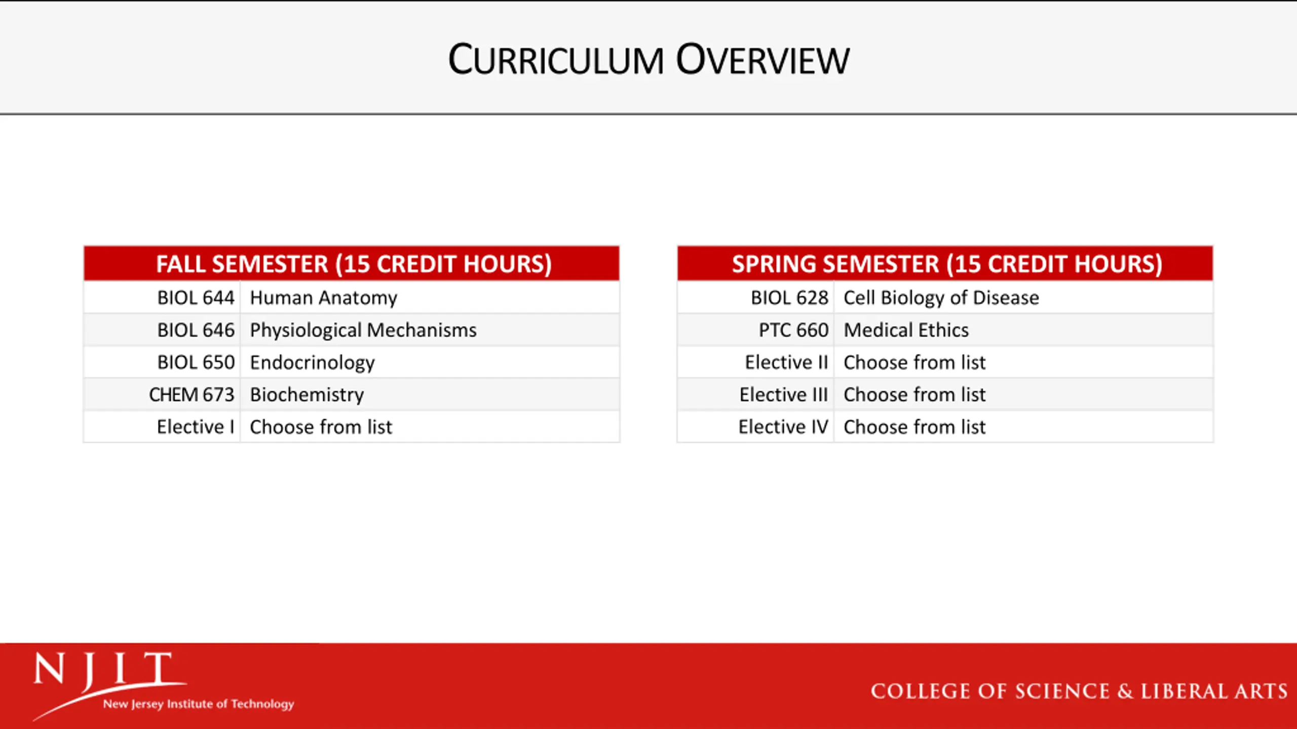 CURRICULUM OVERVIEW FALL SEMESTER (15 CREDIT HOURS) BIOL 644 Human Anatomy BIOL 646 Physiological Mechanisms BIOL 650 Endocrinology CHEM 673 Biochemistry Elective I Choose from list SPRING SEMESTER (15 CREDIT HOURS) BIOL 628 Cell Biology of Disease PTC 660 Medical Ethics Elective II Choose from list Elective III Choose from list Elective IV Choose from list 5/30/2025 4