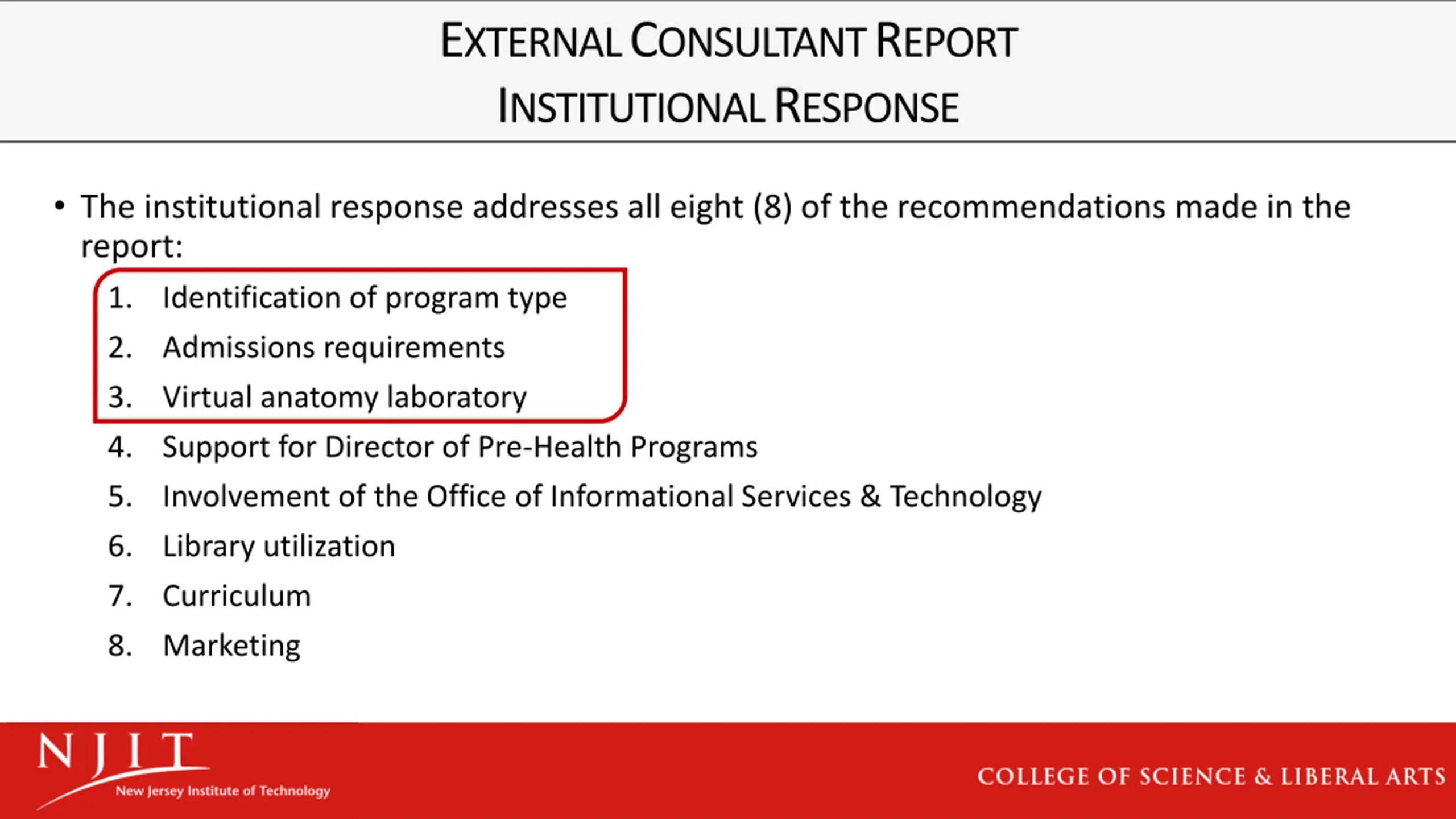 EXTERNAL CONSULTANT REPORT INSTITUTIONAL RESPONSE The institutional response addresses all eight (8) of the recommendations made in the report: 1. Identification of program type 2. Admissions requirements 3. Virtual anatomy laboratory 4. Support for Director of Pre-Health Programs 5. Involvement of the Office of Informational Services & Technology 6. Library utilization 7. Curriculum 8. Marketing 5/30/2025 8