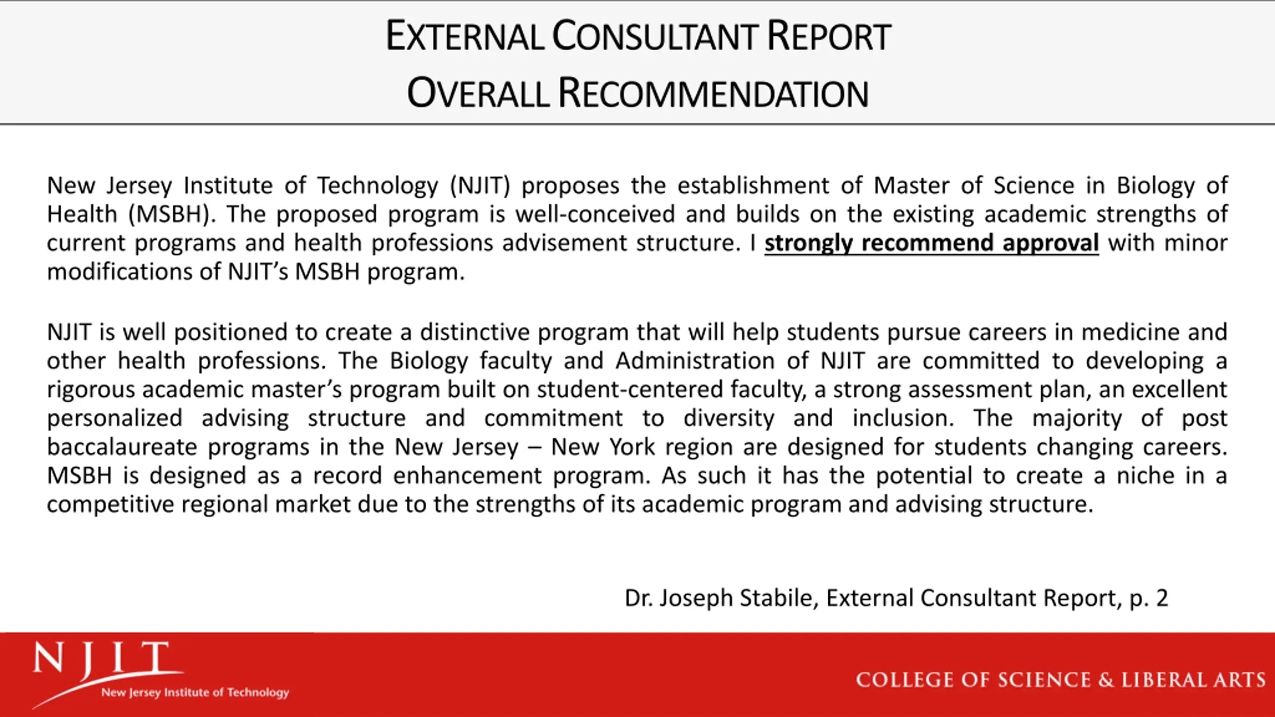 EXTERNAL CONSULTANT REPORT OVERALL RECOMMENDATION New Jersey Institute of Technology (NJIT) proposes the establishment of Master of Science in Biology of Health (MSBH). The proposed program is well-conceived and builds on the existing academic strengths of current programs and health professions advisement structure. I strongly recommend approval with minor modifications of NJIT s MSBH program. NJIT is well positioned to create a distinctive program that will help students pursue careers in medicine and other health professions. The Biology faculty and Administration of NJIT are committed to developing a rigorous academic master s program built on student-centered faculty, a strong assessment plan, an excellent personalized advising structure and commitment to diversity and inclusion. The majority of post baccalaureate programs in the New Jersey New York region are designed for students changing careers. MSBH is designed as a record enhancement program. As such it has the potential to create a niche in a competitive regional market due to the strengths of its academic program and advising structure. Dr. Joseph Stabile, External Consultant Report, p. 2 5/30/2025 7