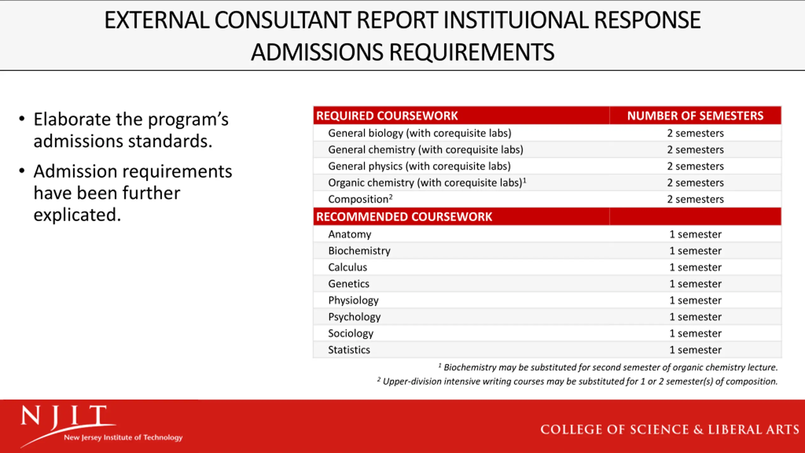 EXTERNAL CONSULTANT REPORT INSTITUIONAL RESPONSE ADMISSIONS REQUIREMENTS Elaborate the program s admissions standards. Admission requirements have been further explicated. REQUIRED COURSEWORK General biology (with corequisite labs) General chemistry (with corequisite labs) General physics (with corequisite labs) Organic chemistry (with corequisite labs)1 Composition2 RECOMMENDED COURSEWORK Anatomy Biochemistry Calculus Genetics Physiology Psychology Sociology Statistics NUMBER OF SEMESTERS 2 semesters 2 semesters 2 semesters 2 semesters 2 semesters 1 semester 1 semester 1 semester 1 semester 1 semester 1 semester 1 semester 1 semester 1 Biochemistry may be substituted for second semester of organic chemistry lecture. 2 Upper-division intensive writing courses may be substituted for 1 or 2 semester(s) of composition. 5/30/2025 10