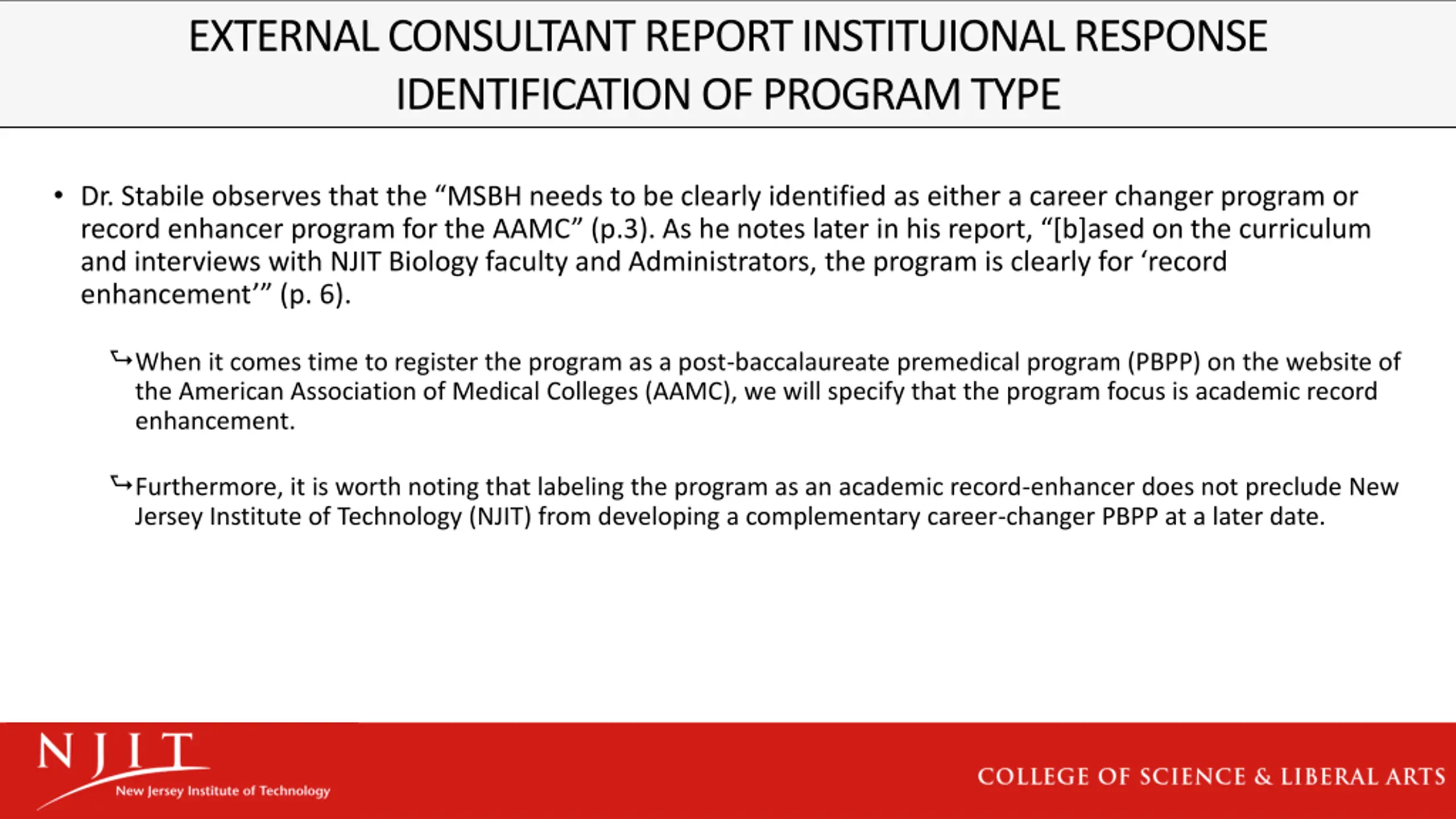 EXTERNAL CONSULTANT REPORT INSTITUIONAL RESPONSE IDENTIFICATION OF PROGRAM TYPE Dr. Stabile observes that the MSBH needs to be clearly identified as either a career changer program or record enhancer program for the AAMC (p.3). As he notes later in his report, [b]ased on the curriculum and interviews with NJIT Biology faculty and Administrators, the program is clearly for record enhancement (p. 6). When it comes time to register the program as a post-baccalaureate premedical program (PBPP) on the website of the American Association of Medical Colleges (AAMC), we will specify that the program focus is academic record enhancement. Furthermore, it is worth noting that labeling the program as an academic record-enhancer does not preclude New Jersey Institute of Technology (NJIT) from developing a complementary career-changer PBPP at a later date. 5/30/2025 9