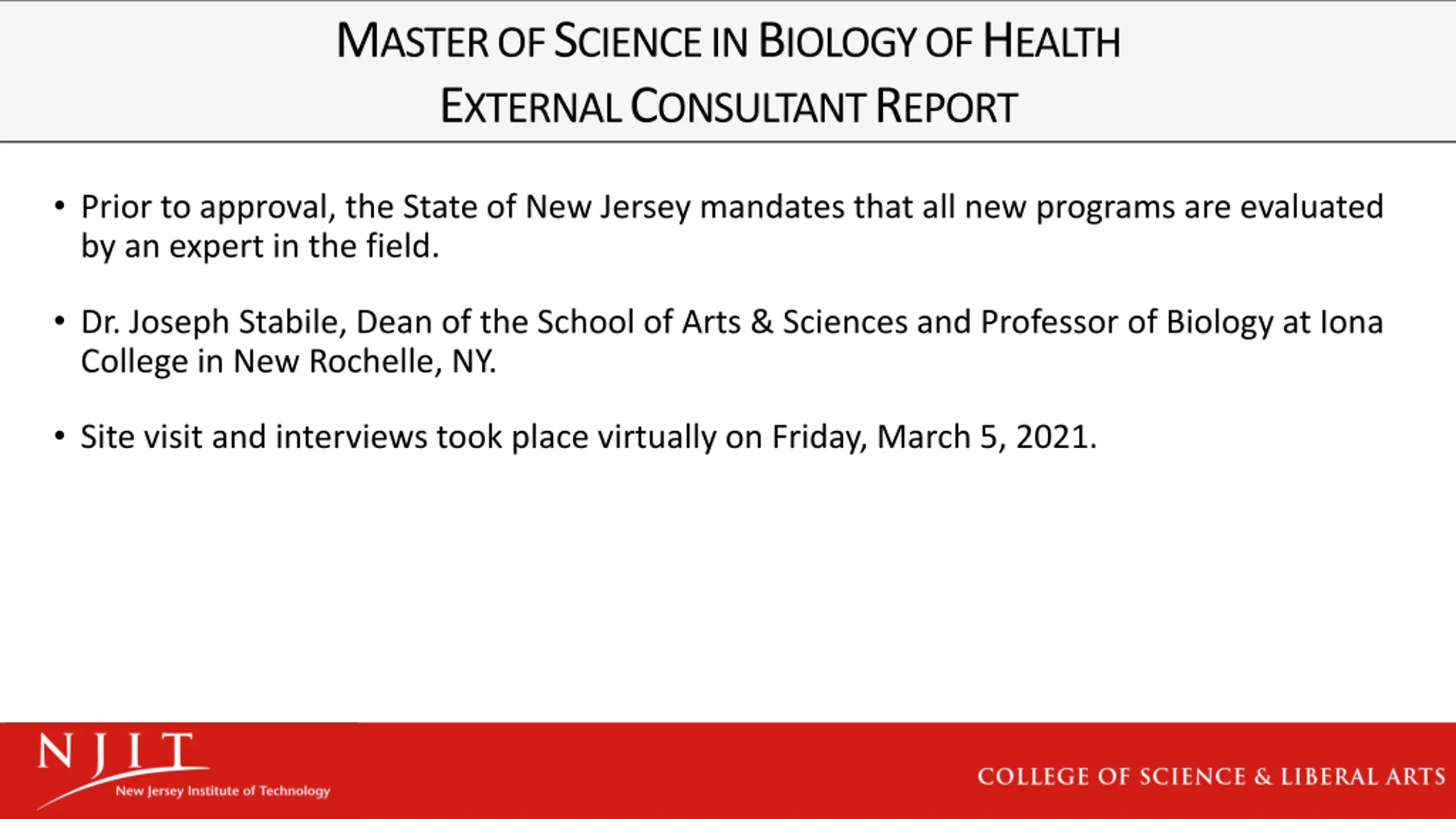 MASTER OF SCIENCE IN BIOLOGY OF HEALTH EXTERNAL CONSULTANT REPORT Prior to approval, the State of New Jersey mandates that all new programs are evaluated by an expert in the field. Dr. Joseph Stabile, Dean of the School of Arts & Sciences and Professor of Biology at Iona College in New Rochelle, NY. Site visit and interviews took place virtually on Friday, March 5, 2021. 5/30/2025 6
