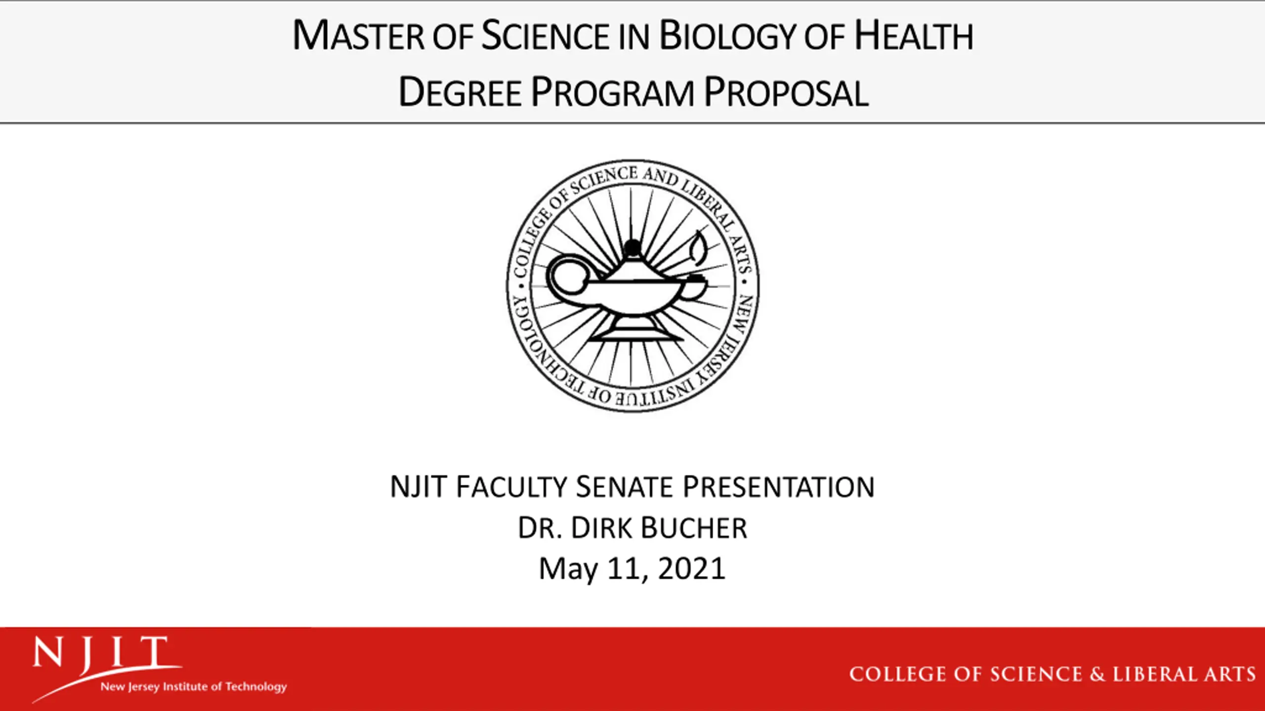 MASTER OF SCIENCE IN BIOLOGY OF HEALTH DEGREE PROGRAM PROPOSAL NJIT FACULTY SENATE PRESENTATION DR. DIRK BUCHER May 11, 2021 5/30/2025 2