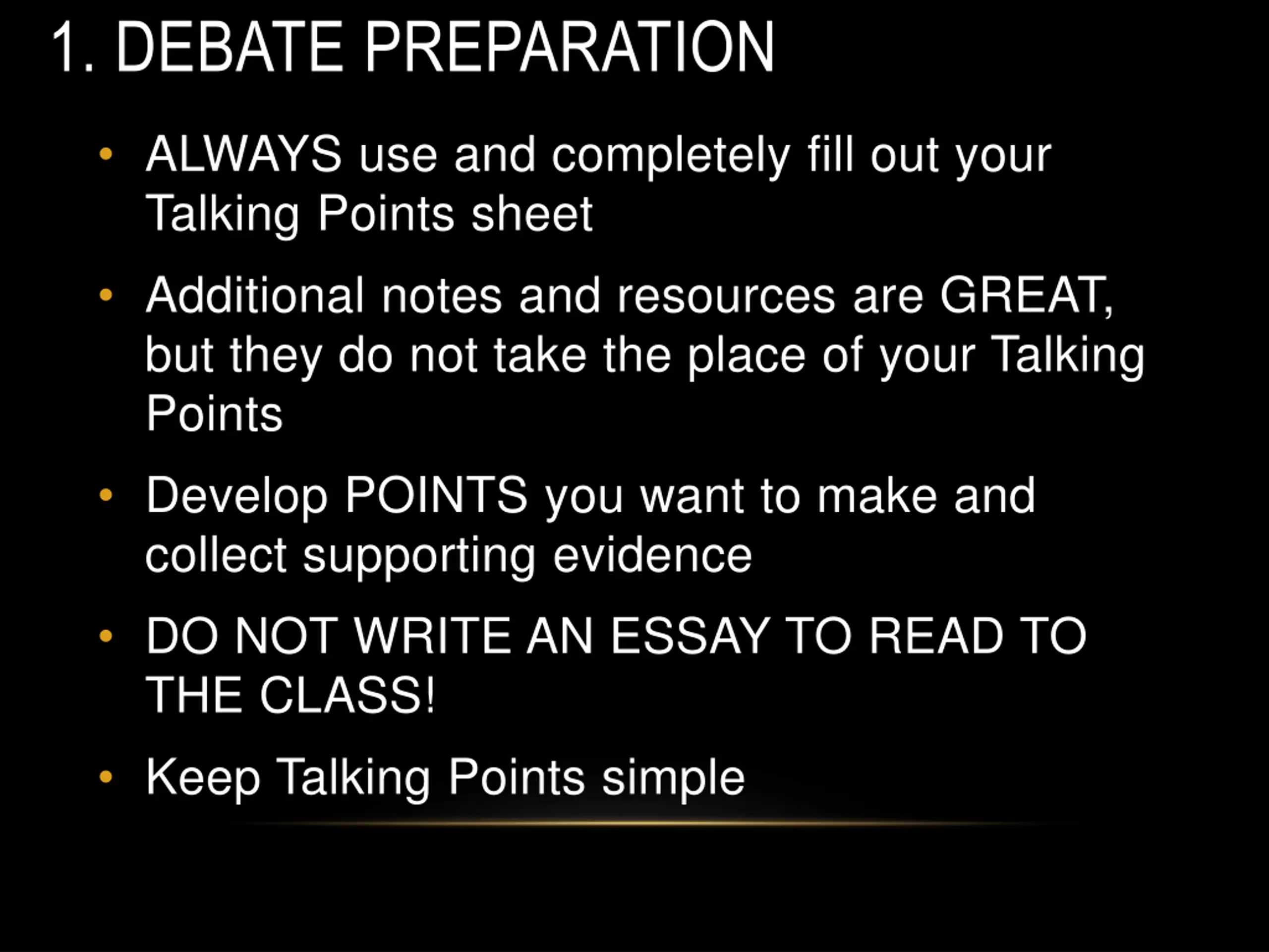 1. DEBATE PREPARATION ALWAYS use and completely fill out your Talking Points sheet Additional notes and resources are GREAT, but they do not take the place of your Talking Points Develop POINTS you want to make and collect supporting evidence DO NOT WRITE AN ESSAY TO READ TO THE CLASS! Keep Talking Points simple