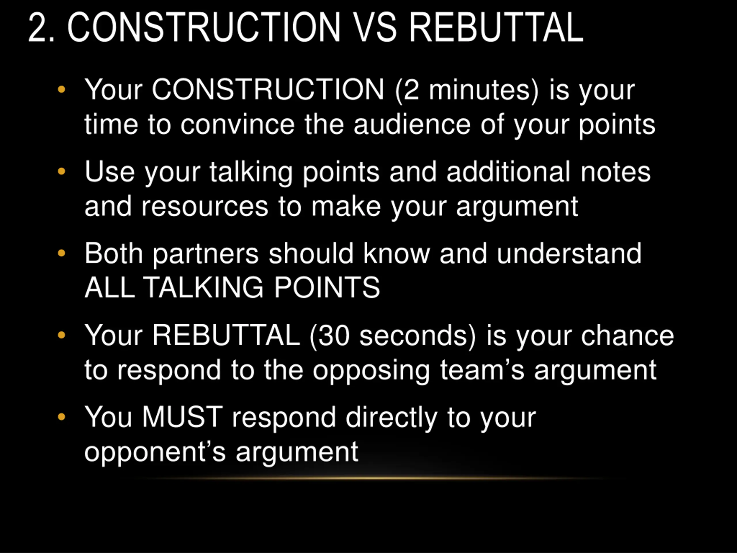 2. CONSTRUCTION VS REBUTTAL Your CONSTRUCTION (2 minutes) is your time to convince the audience of your points Use your talking points and additional notes and resources to make your argument Both partners should know and understand ALL TALKING POINTS Your REBUTTAL (30 seconds) is your chance to respond to the opposing team s argument You MUST respond directly to your opponent s argument