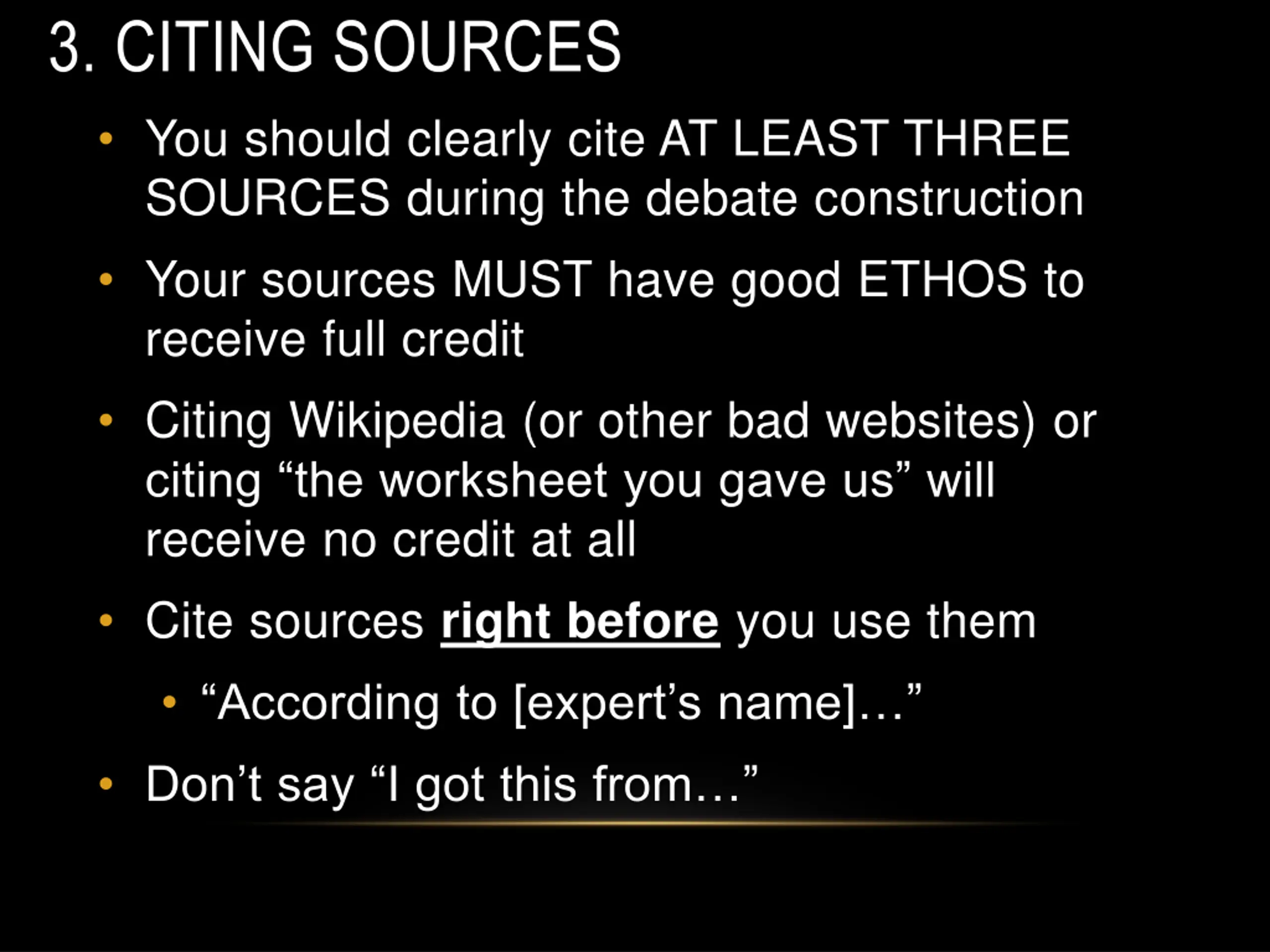 3. CITING SOURCES You should clearly cite AT LEAST THREE SOURCES during the debate construction Your sources MUST have good ETHOS to receive full credit Citing Wikipedia (or other bad websites) or citing the worksheet you gave us will receive no credit at all Cite sources right before you use them According to [expert s name] Don t say I got this from