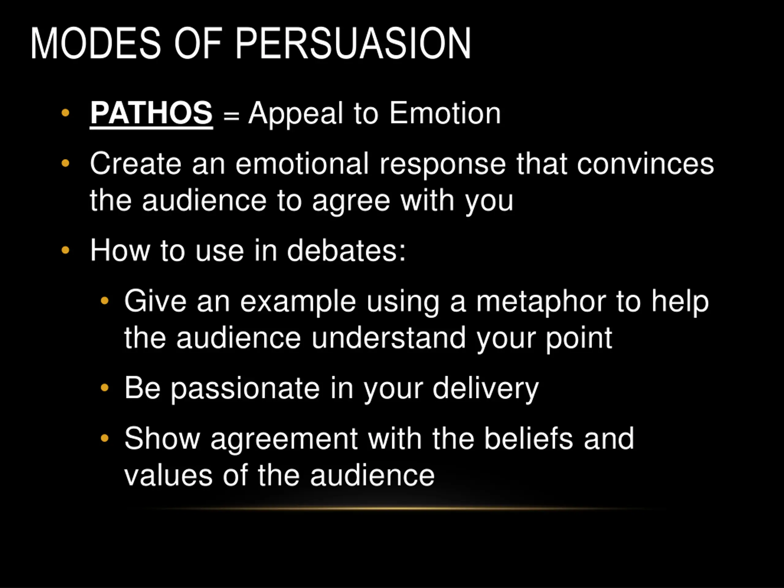 MODES OF PERSUASION PATHOS = Appeal to Emotion Create an emotional response that convinces the audience to agree with you How to use in debates: Give an example using a metaphor to help the audience understand your point Be passionate in your delivery Show agreement with the beliefs and values of the audience
