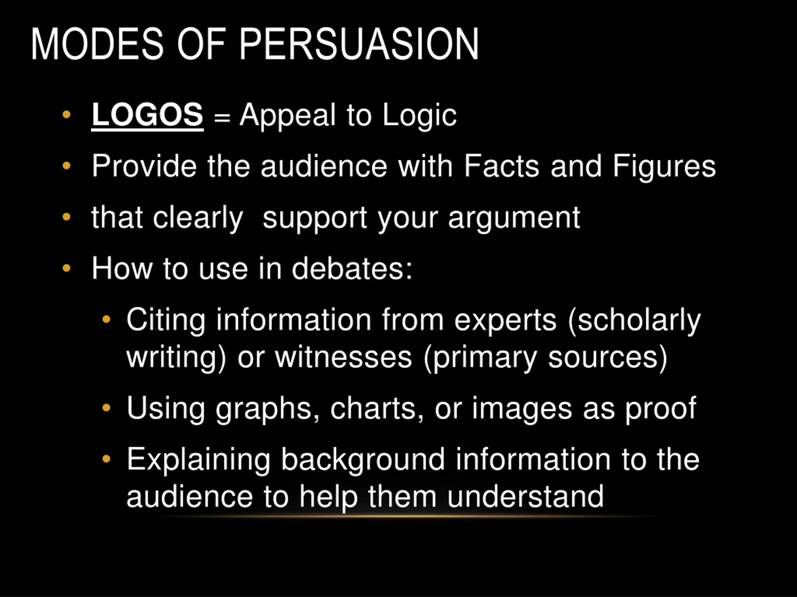 MODES OF PERSUASION LOGOS = Appeal to Logic Provide the audience with Facts and Figures that clearly support your argument How to use in debates: Citing information from experts (scholarly writing) or witnesses (primary sources) Using graphs, charts, or images as proof Explaining background information to the audience to help them understand