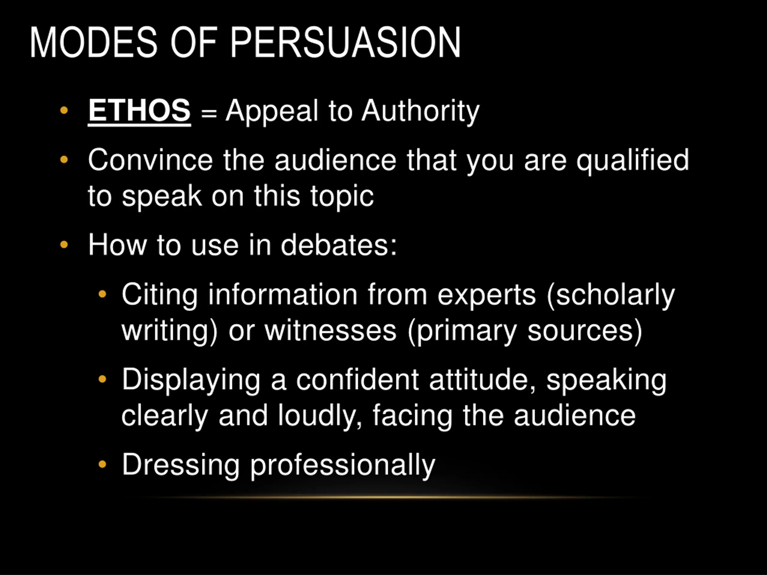 MODES OF PERSUASION ETHOS = Appeal to Authority Convince the audience that you are qualified to speak on this topic How to use in debates: Citing information from experts (scholarly writing) or witnesses (primary sources) Displaying a confident attitude, speaking clearly and loudly, facing the audience Dressing professionally