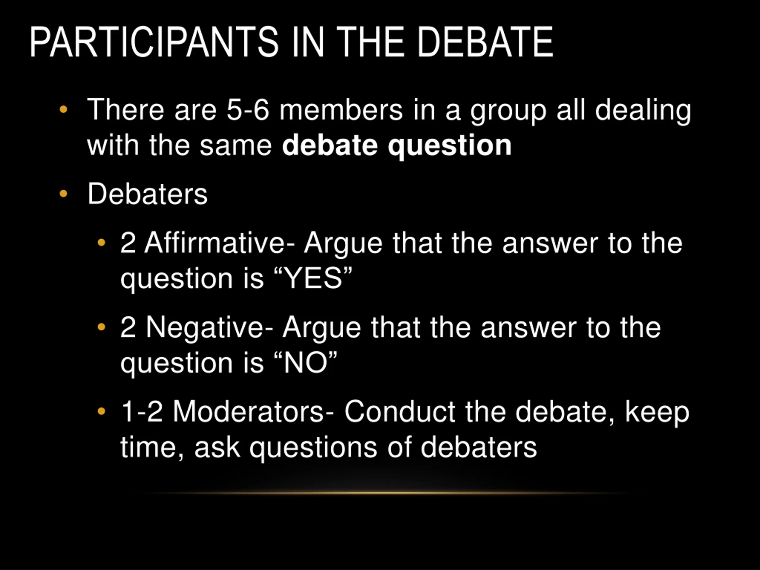 PARTICIPANTS IN THE DEBATE There are 5-6 members in a group all dealing with the same debate question Debaters 2 Affirmative- Argue that the answer to the question is YES 2 Negative- Argue that the answer to the question is NO 1-2 Moderators- Conduct the debate, keep time, ask questions of debaters