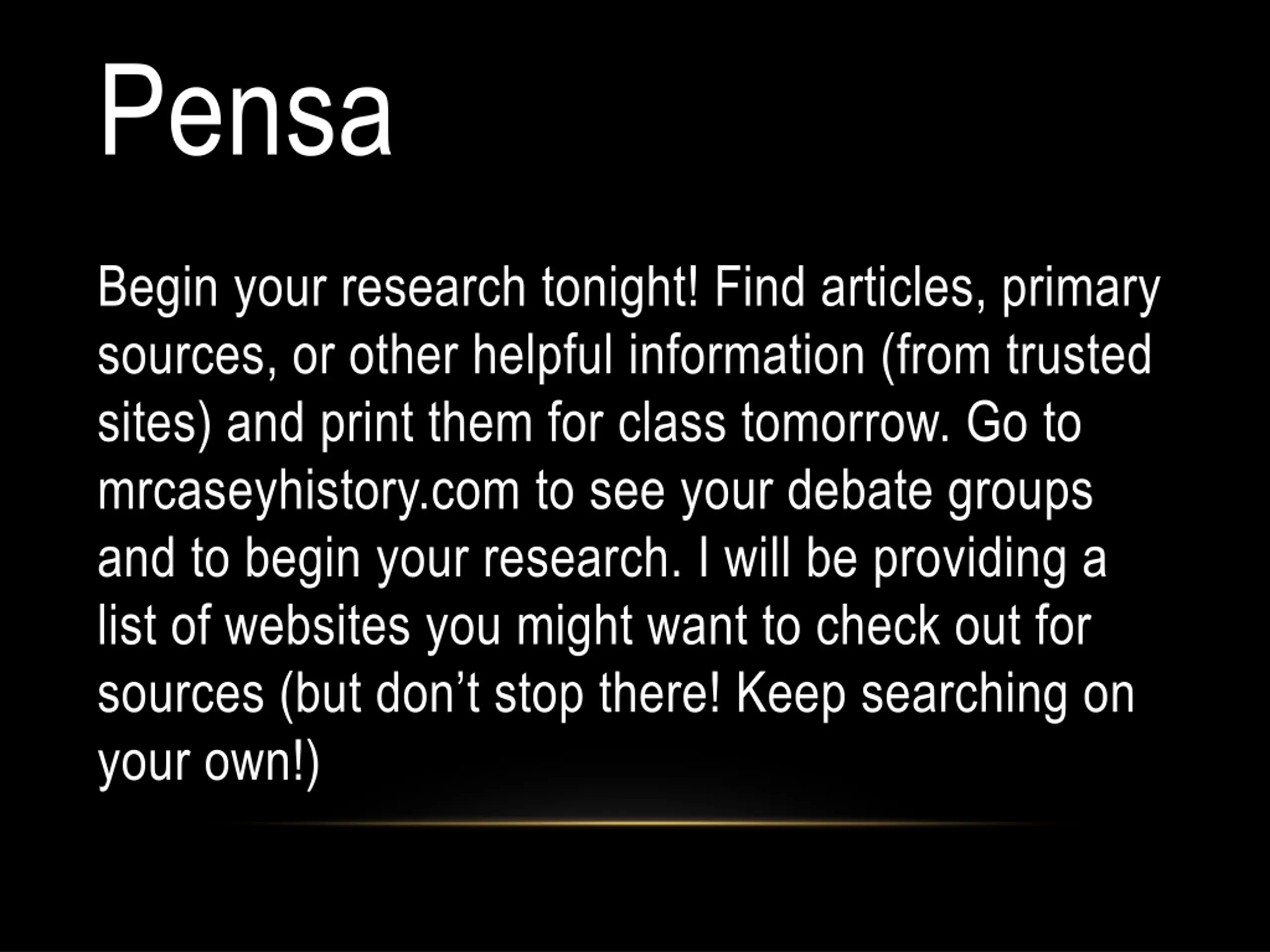 Pensa Begin your research tonight! Find articles, primary sources, or other helpful information (from trusted sites) and print them for class tomorrow. Go to mrcaseyhistory.com to see your debate groups and to begin your research. I will be providing a list of websites you might want to check out for sources (but don t stop there! Keep searching on your own!)