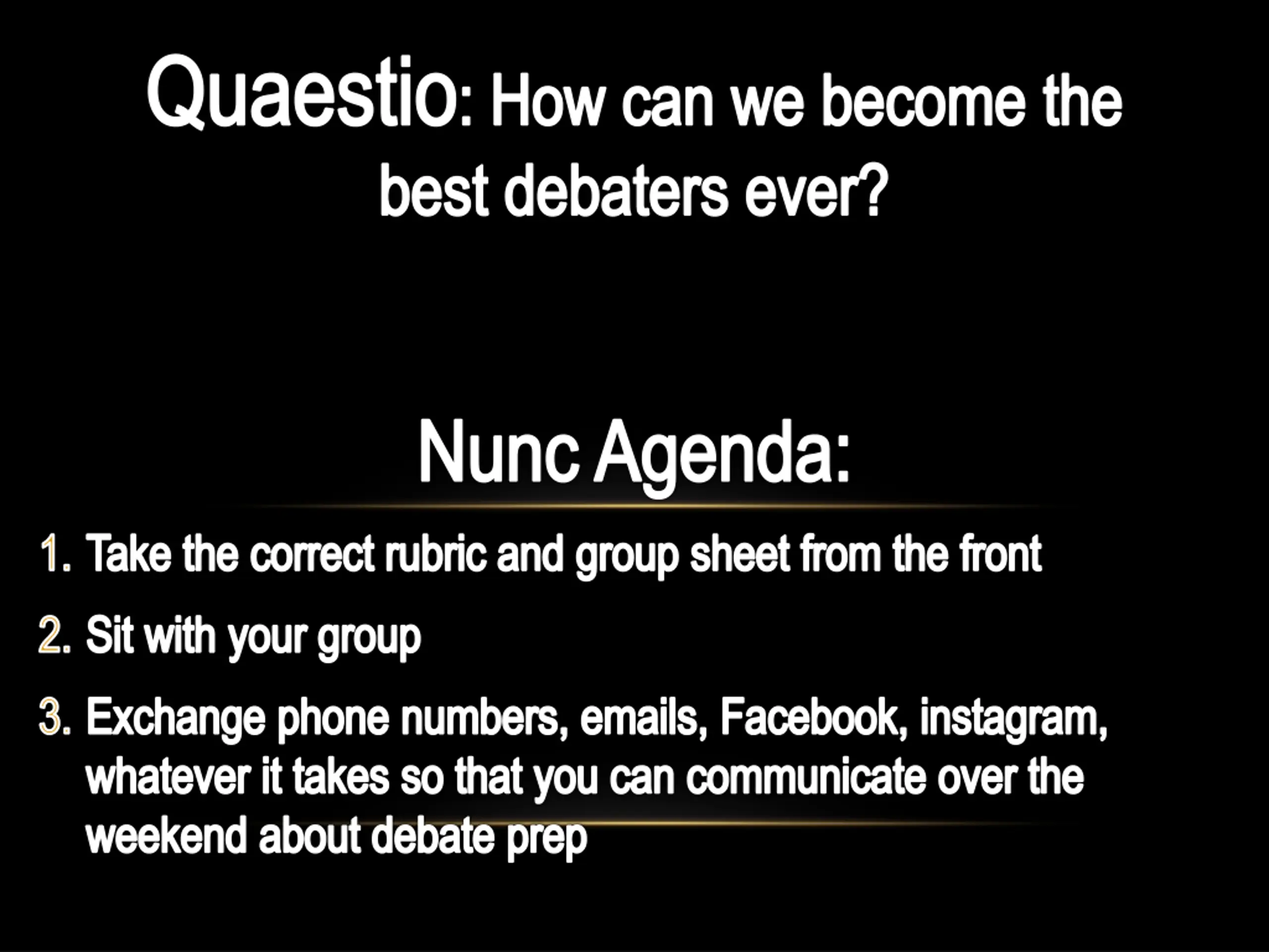 Quaestio: How can we become the best debaters ever? NuncAgenda: Take the correct rubric and group sheet from the front Sit with your group Exchange phone numbers, emails, Facebook, instagram, whatever it takes so that you can communicate over the weekend about debate prep