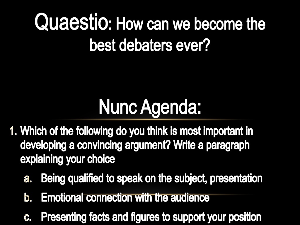 Quaestio: How can we become the best debaters ever? NuncAgenda: Which of the following do you think is most important in developing a convincing argument? Write a paragraph explaining your choice Being qualified to speak on the subject, presentation Emotional connection with the audience Presenting facts and figures to support your position