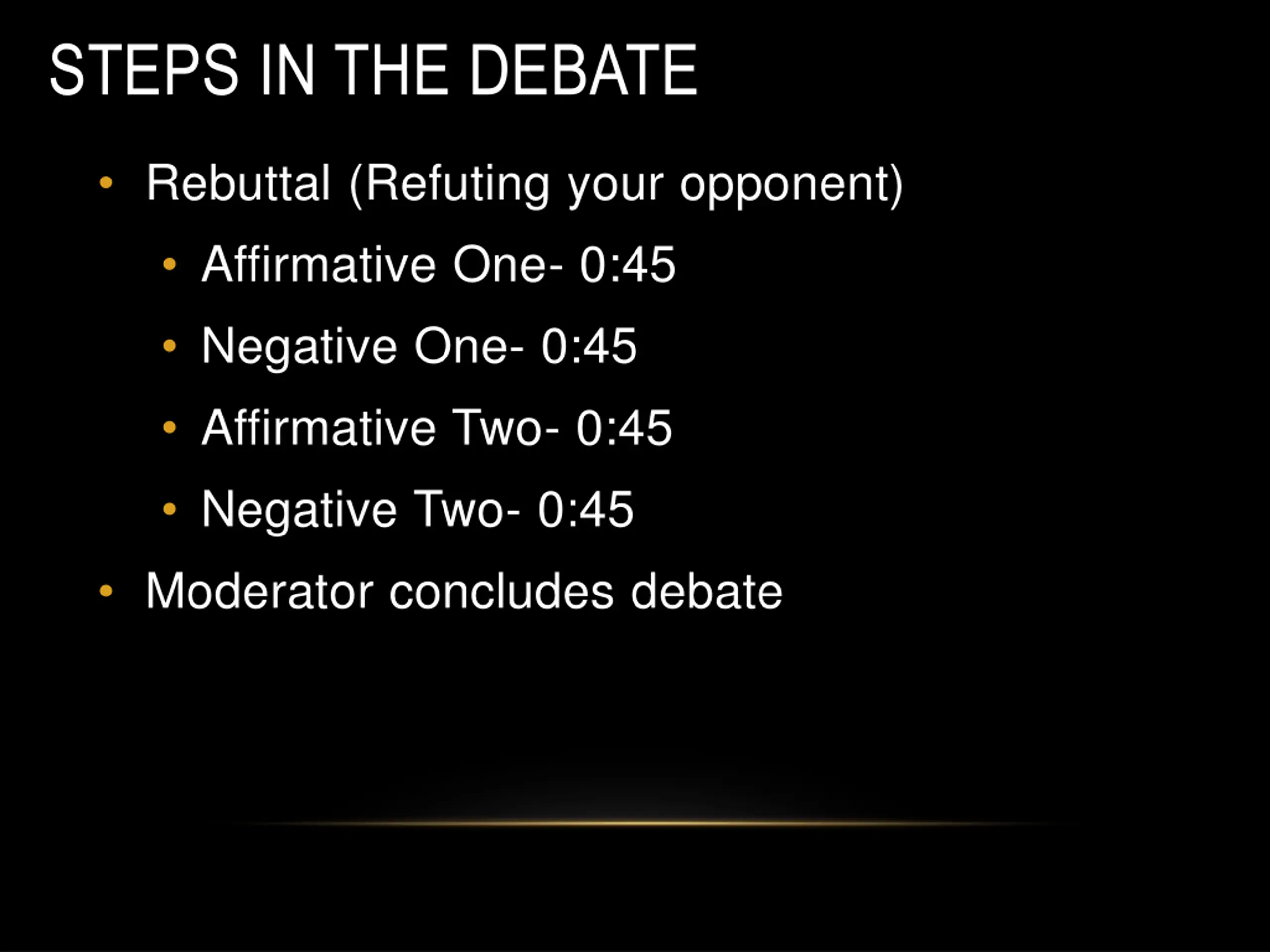 STEPS IN THE DEBATE Rebuttal (Refuting your opponent) Affirmative One- 0:45 Negative One- 0:45 Affirmative Two- 0:45 Negative Two- 0:45 Moderator concludes debate