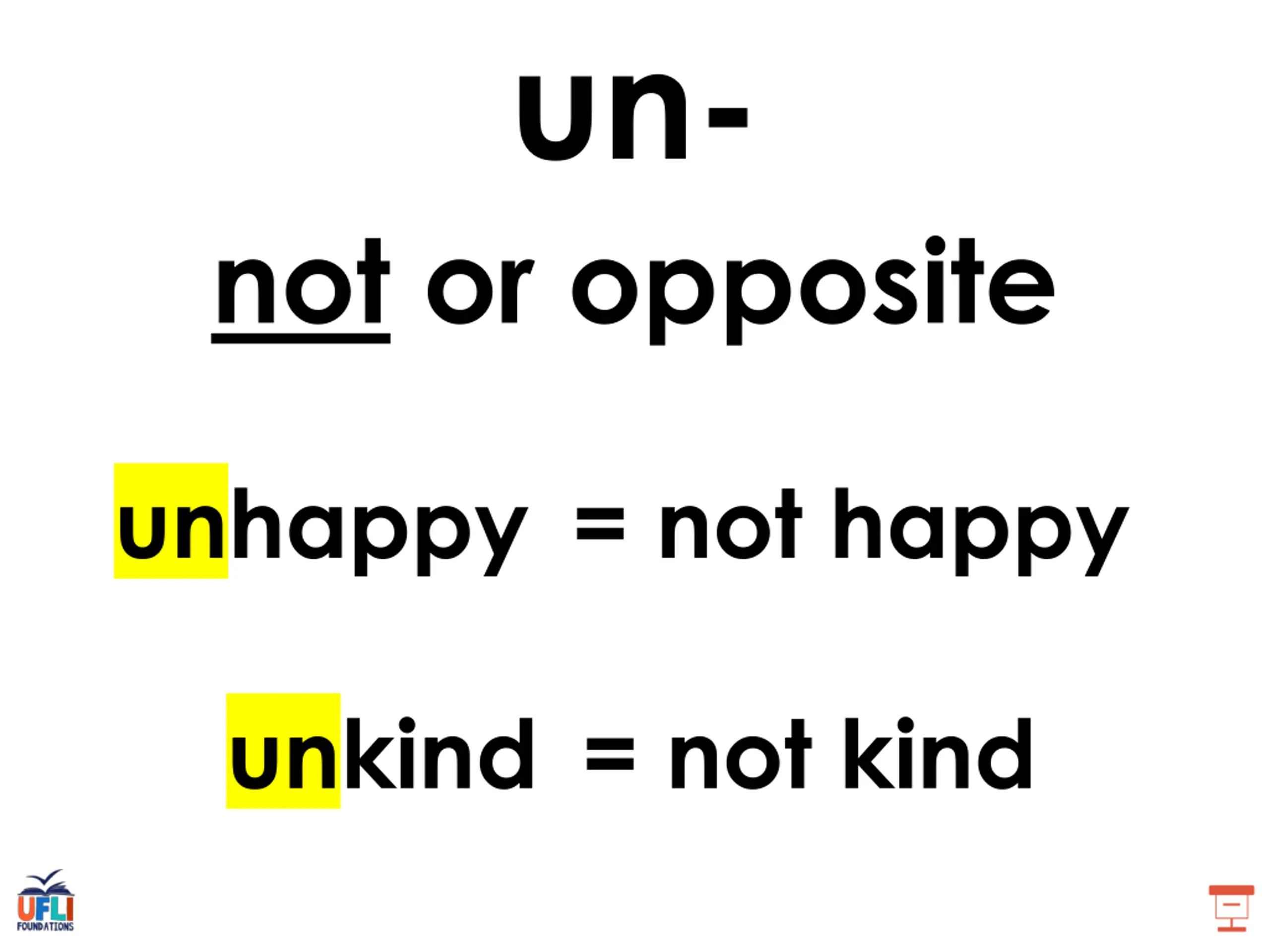 un- not or opposite unhappy = not happy unkind = not kind