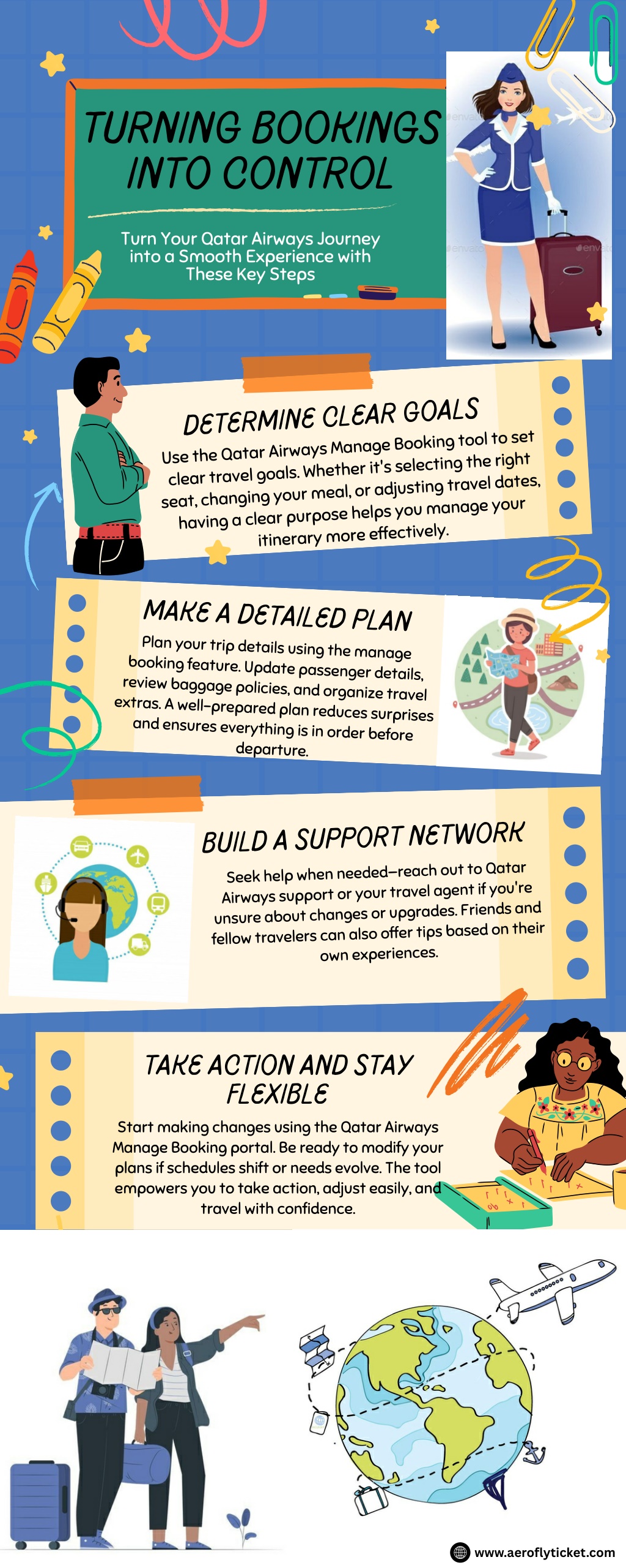 TURNING BOOKINGS INTO CONTROL Turn Your Qatar Airways Journey into a Smooth Experience with These Key Steps DETERMINE CLEAR GOALS Use the Qatar Airways Manage Booking tool to set clear travel goals. Whether it's selecting the right seat, changing your meal, or adjusting travel dates, having a clear purpose helps you manage your itinerary more effectively. MAKE A DETAILED PLAN Plan your trip details using the manage booking feature. Update passenger details, review baggage policies, and organize travel extras. A well-prepared plan reduces surprises and ensures everything is in order before departure. BUILD A SUPPORT NETWORK Seek help when needed reach out to Qatar Airways support or your travel agent if you're unsure about changes or upgrades. Friends and fellow travelers can also offer tips based on their own experiences. TAKE ACTION AND STAY FLEXIBLE Start making changes using the Qatar Airways Manage Booking portal. Be ready to modify your plans if schedules shift or needs evolve. The tool empowers you to take action, adjust easily, and travel with confidence. www.aeroflyticket.com