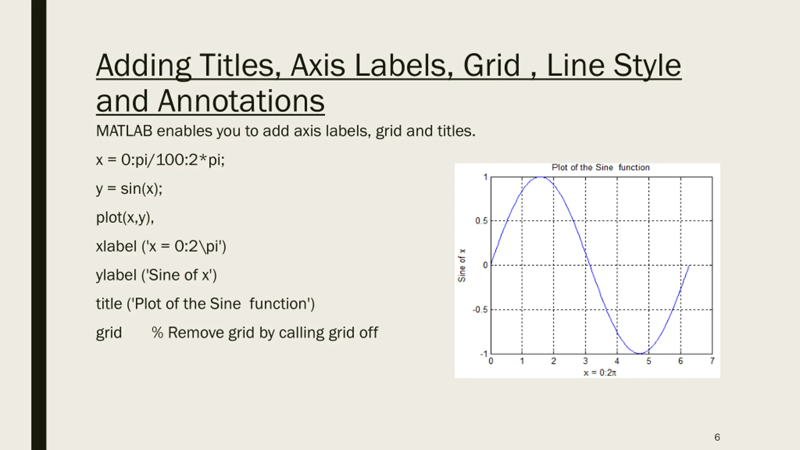 Adding Titles, Axis Labels, Grid , Line Style and Annotations MATLAB enables you to add axis labels, grid and titles. x = 0:pi/100:2*pi; y = sin(x); plot(x,y), xlabel ('x = 0:2\pi') ylabel ('Sine of x') title ('Plot of the Sine function') grid % Remove grid by calling grid off 6