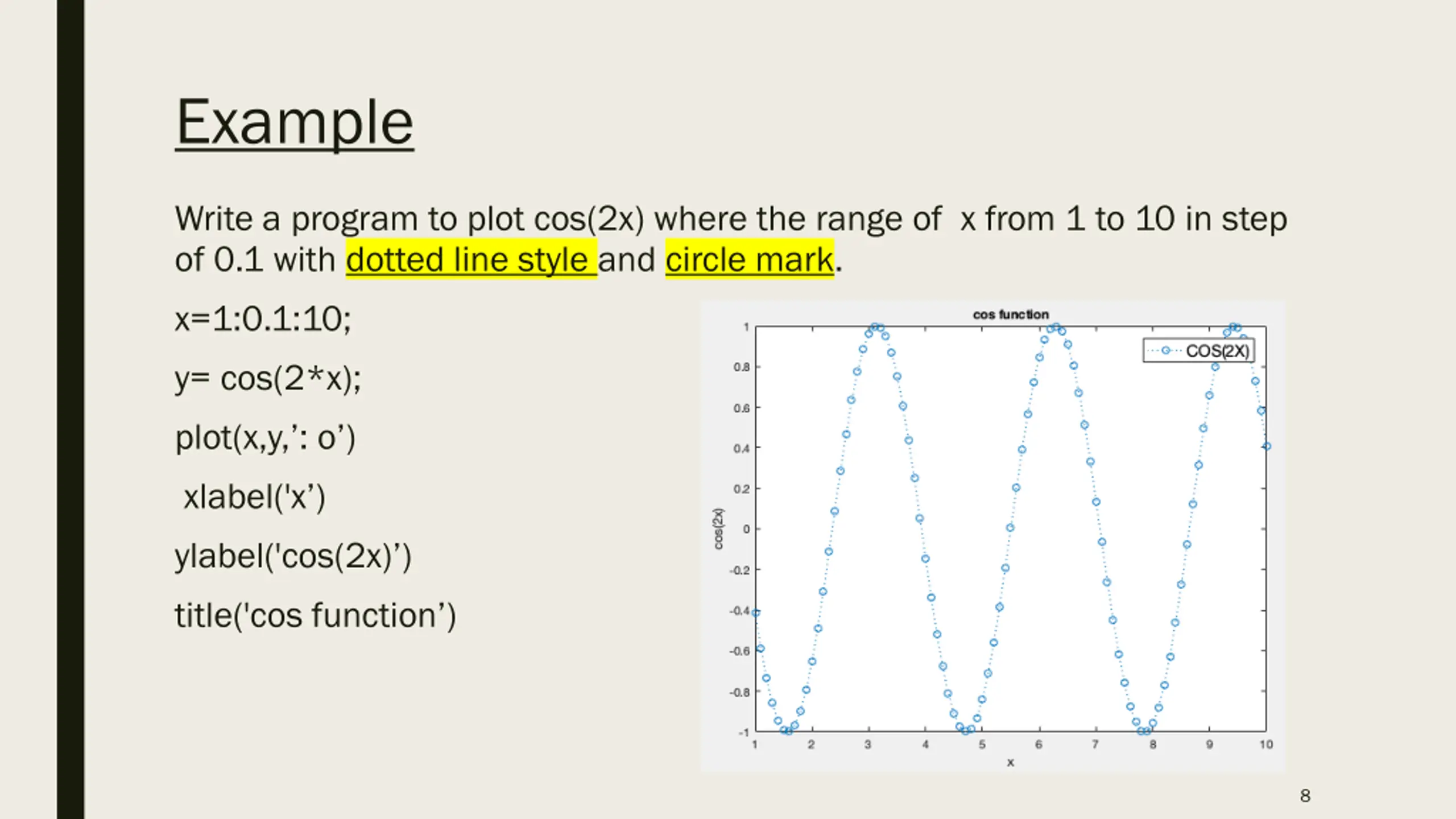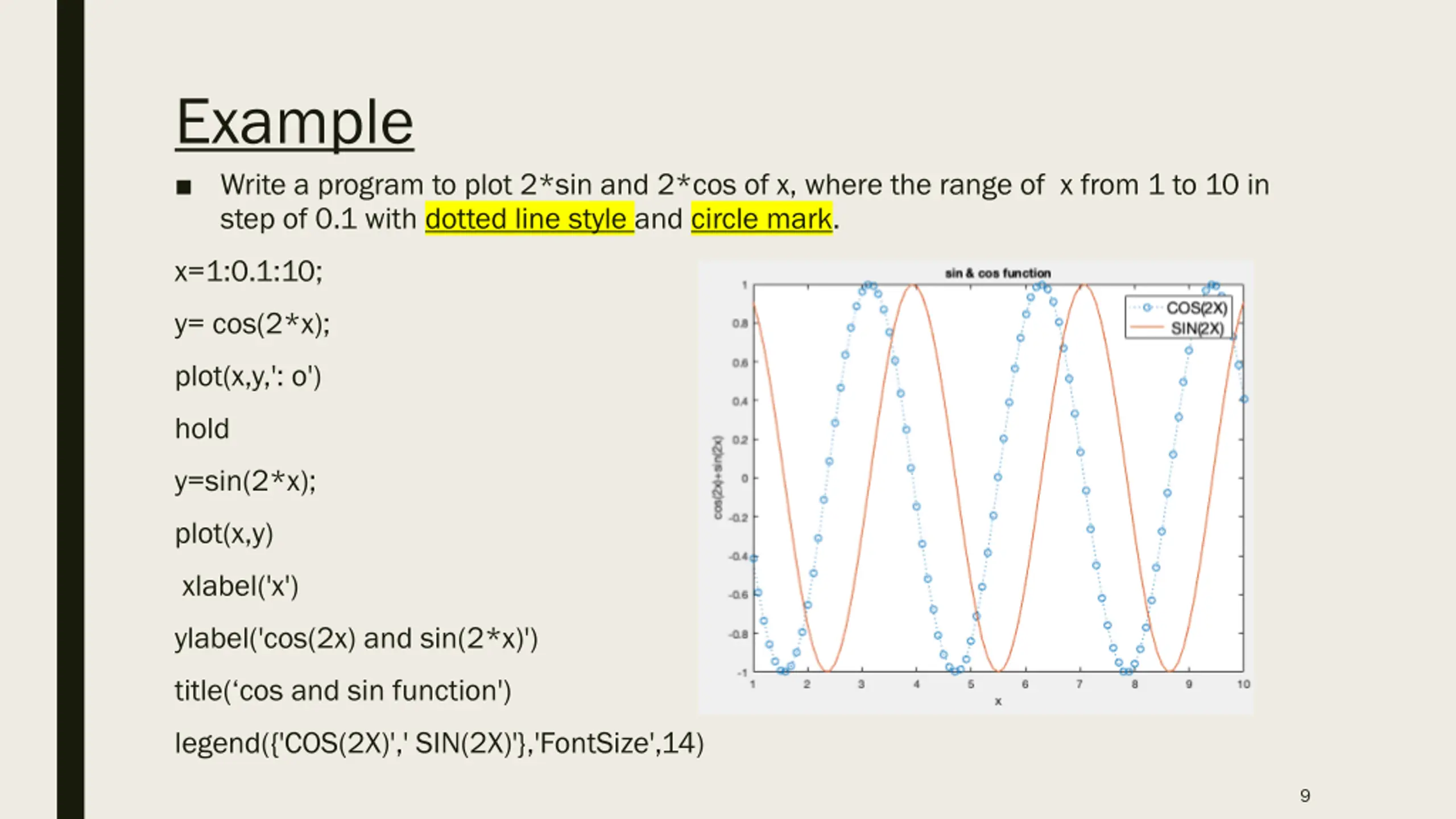 Example Write a program to plot cos(2x) where the range of x from 1 to 10 in step of 0.1 with dotted line style and circle mark. x=1:0.1:10; y= cos(2*x); plot(x,y, : o ) xlabel('x ) ylabel('cos(2x) ) title('cos function ) 8