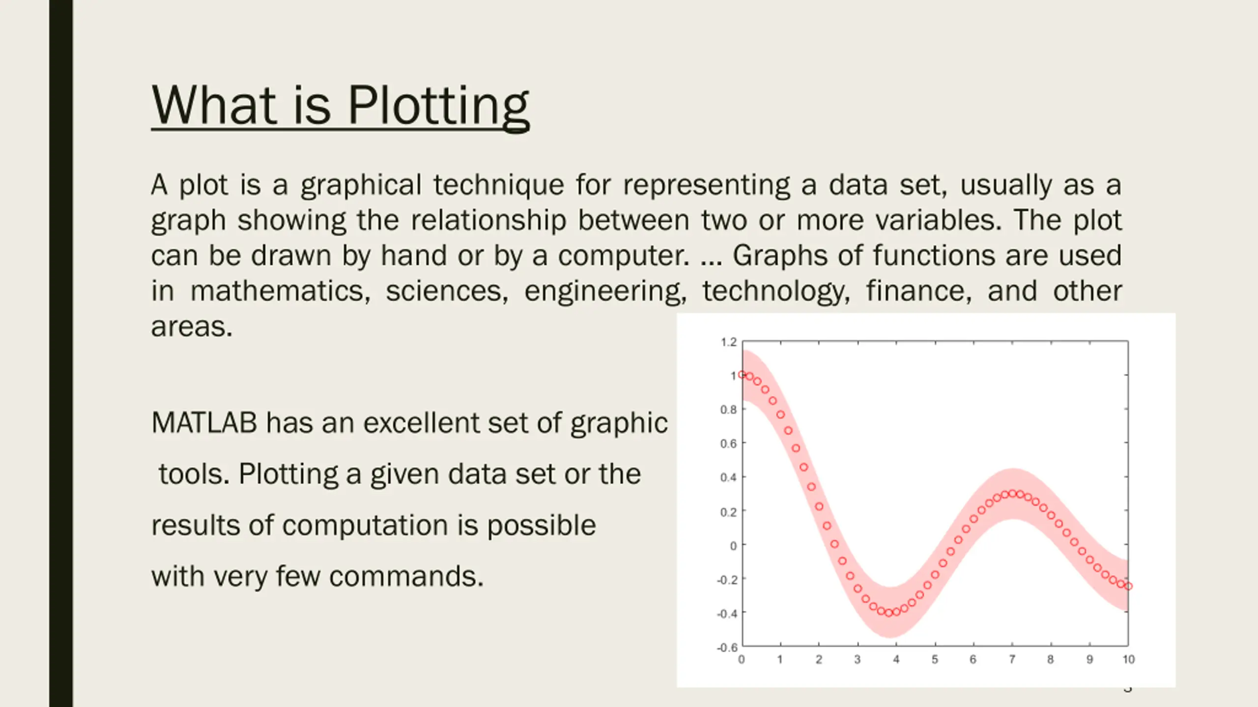 What is Plotting A plot is a graphical technique for representing a data set, usually as a graph showing the relationship between two or more variables. The plot can be drawn by hand or by a computer. ... Graphs of functions are used in mathematics, sciences, engineering, technology, finance, and other areas. MATLAB has an excellent set of graphic tools. Plotting a given data set or the results of computation is possible with very few commands. 3