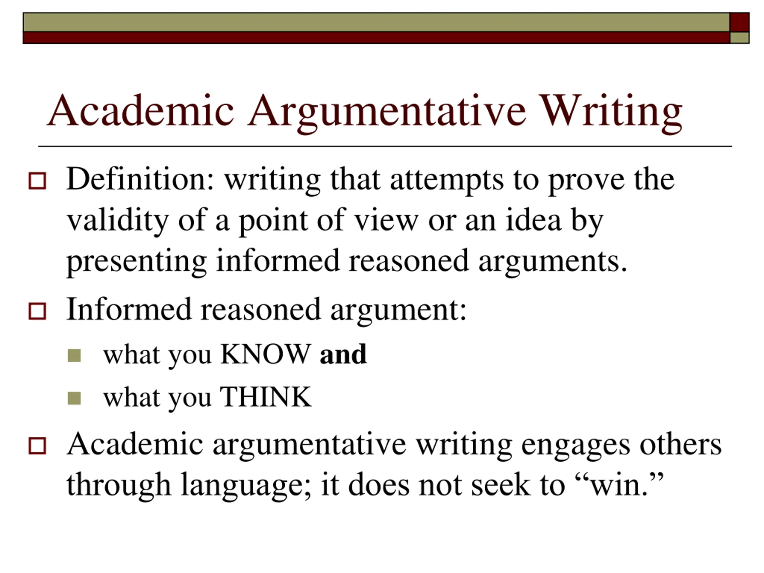 Academic Argumentative Writing Definition: writing that attempts to prove the validity of a point of view or an idea by presenting informed reasoned arguments. Informed reasoned argument: what you KNOW and what you THINK Academic argumentative writing engages others through language; it does not seek to win.