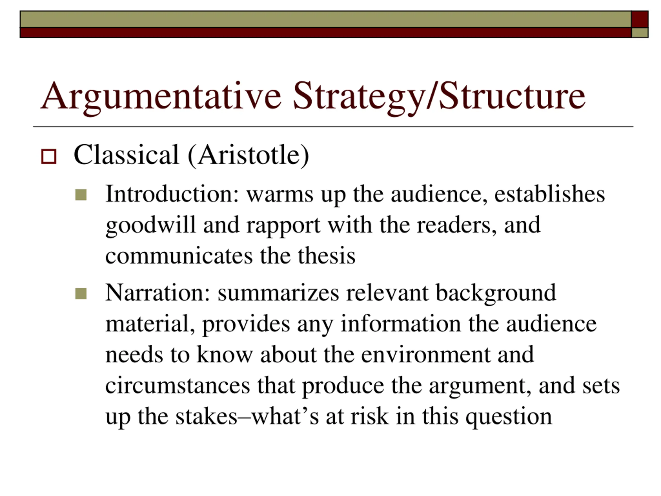 Argumentative Strategy/Structure Classical (Aristotle) Introduction: warms up the audience, establishes goodwill and rapport with the readers, and communicates the thesis Narration: summarizes relevant background material, provides any information the audience needs to know about the environment and circumstances that produce the argument, and sets up the stakes what s at risk in this question
