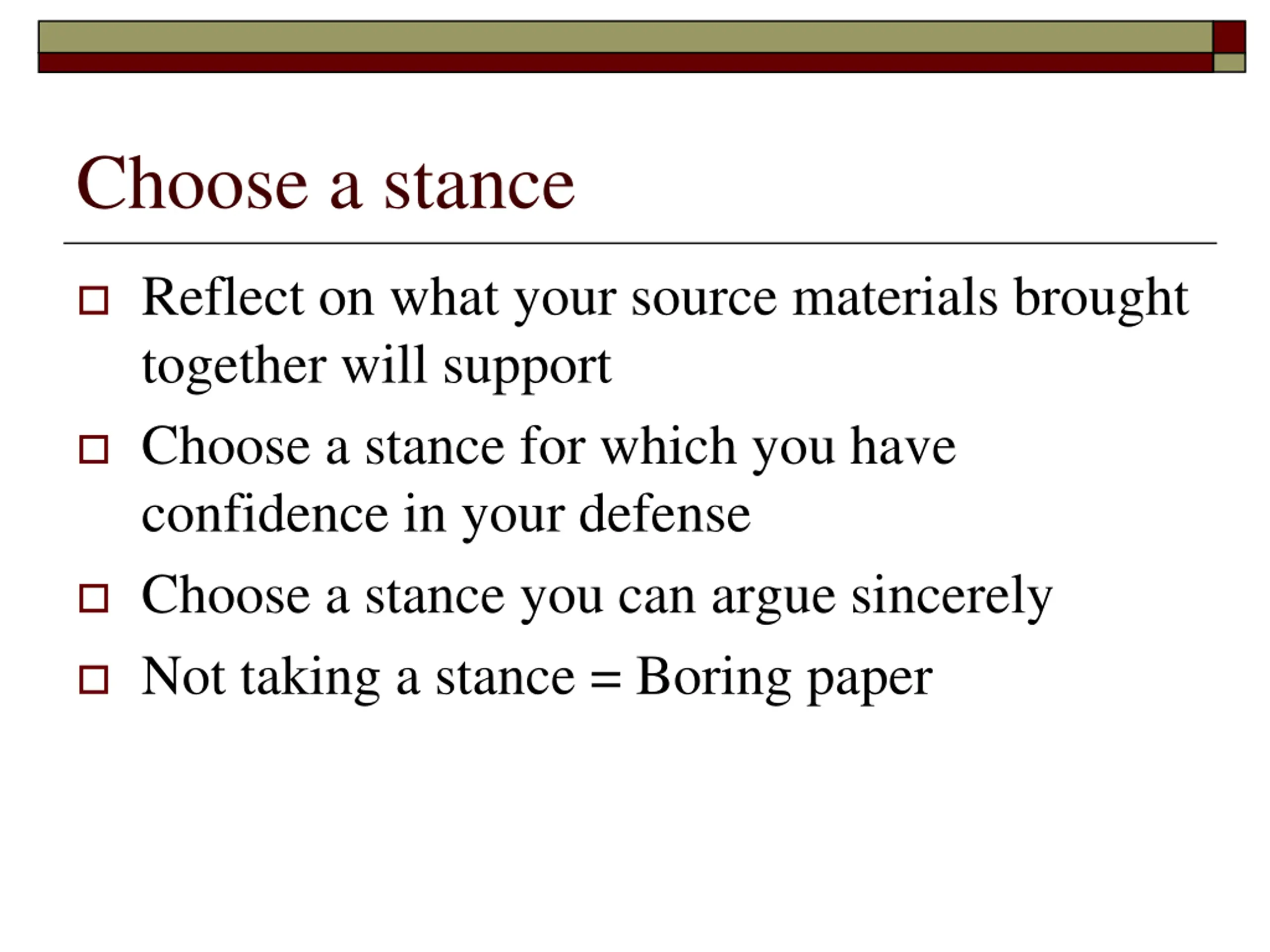 Choose a stance Reflect on what your source materials brought together will support Choose a stance for which you have confidence in your defense Choose a stance you can argue sincerely Not taking a stance = Boring paper