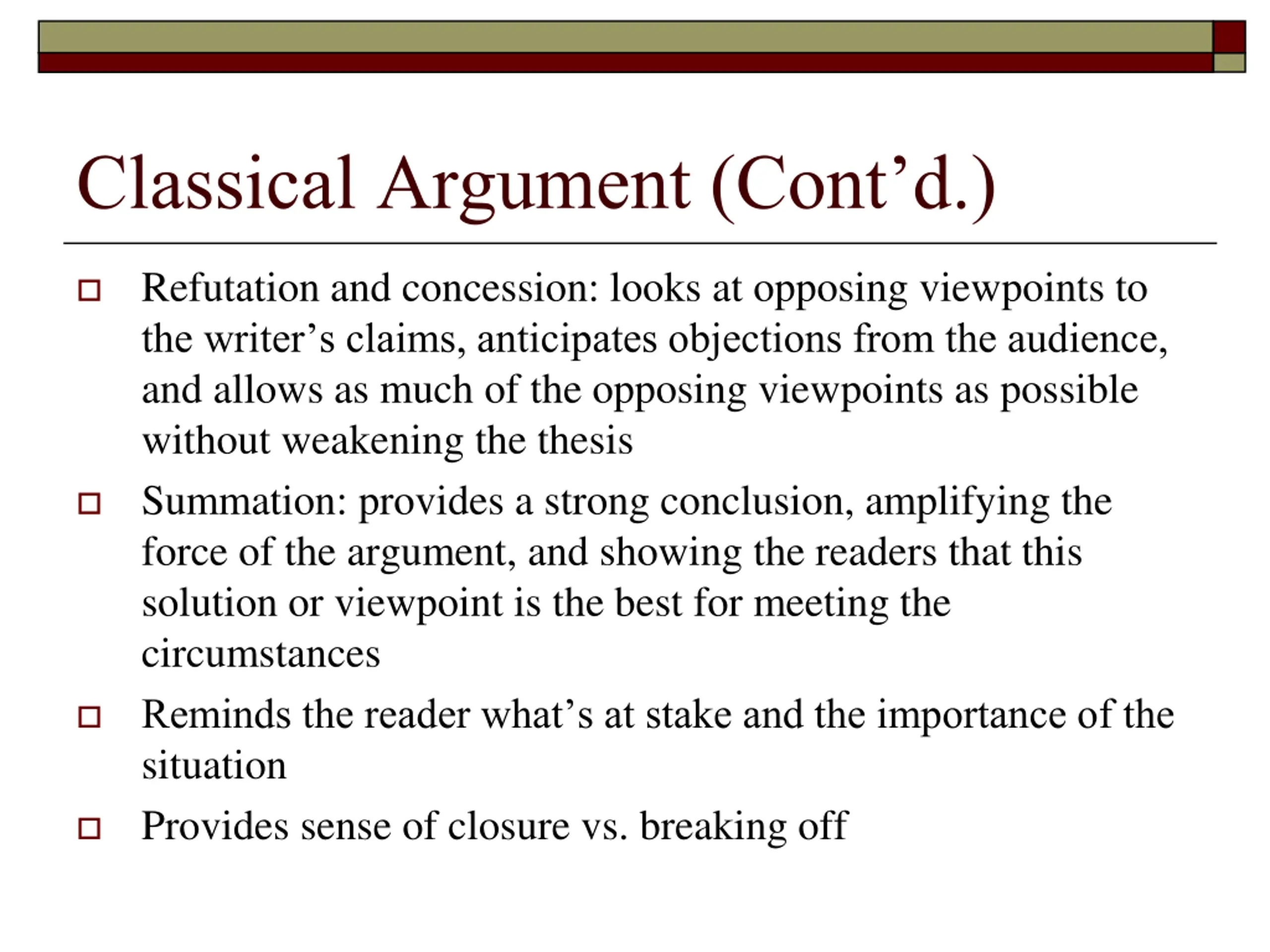 Classical Argument (Contd.) Refutation and concession: looks at opposing viewpoints to the writer s claims, anticipates objections from the audience, and allows as much of the opposing viewpoints as possible without weakening the thesis Summation: provides a strong conclusion, amplifying the force of the argument, and showing the readers that this solution or viewpoint is the best for meeting the circumstances Reminds the reader what s at stake and the importance of the situation Provides sense of closure vs. breaking off